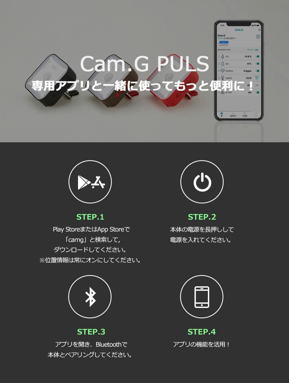 ・Cam.G アプリはAndroid、iPhone専用です。ダウンロードの際は位置情報を常にオンで設定してください。