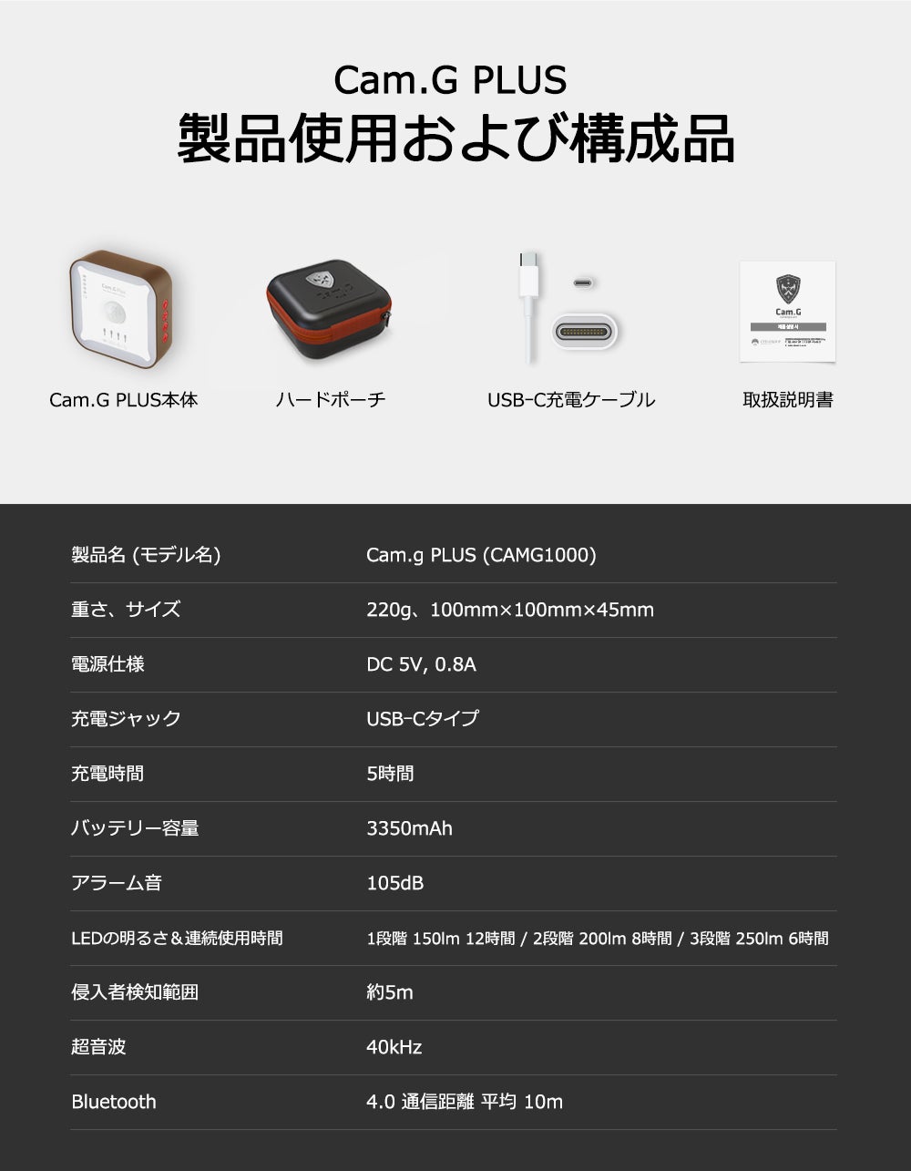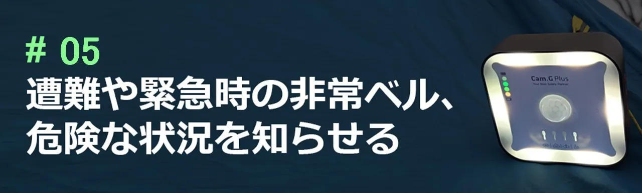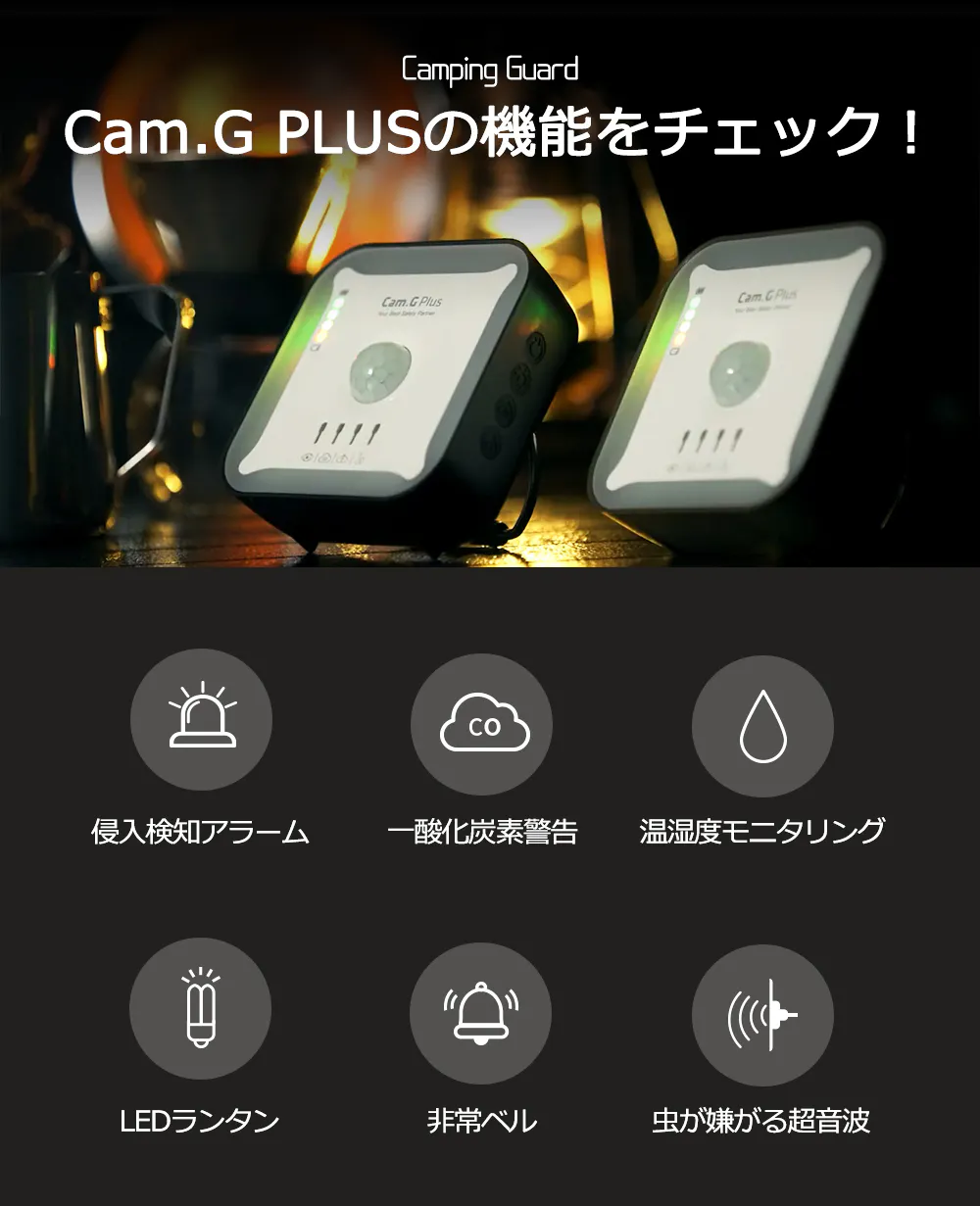 この度、アップグレードしたポータブルセキュリティツール「Cam.G PLUS」をご紹介しております。キャンプなどのアウトドア活動、さらには普段からも使える心強い6大機能が揃ったマルチツールです。Cam.GとはCAMPING GUARD(キャンピングガード)の略字です。この製品で皆さまの日常やアウトドア活動が少しでも安全に豊かに過ごせるようになることを願っています。