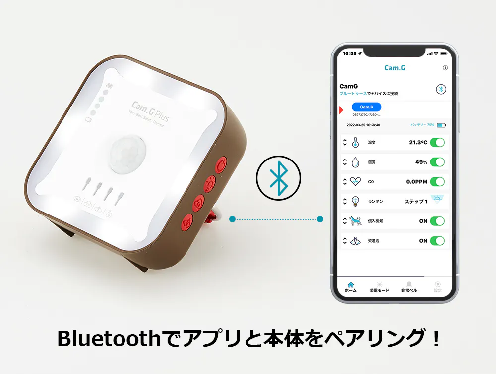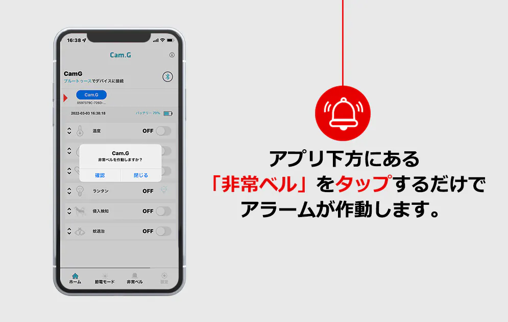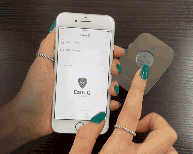 Cam.G PLUS本体と専用アプリ(本体とペアリングしているデバイス)から同時にアラームが鳴り、侵入者から身を守ることができます。また、貴重品などの盗難防止にも役立ちます。