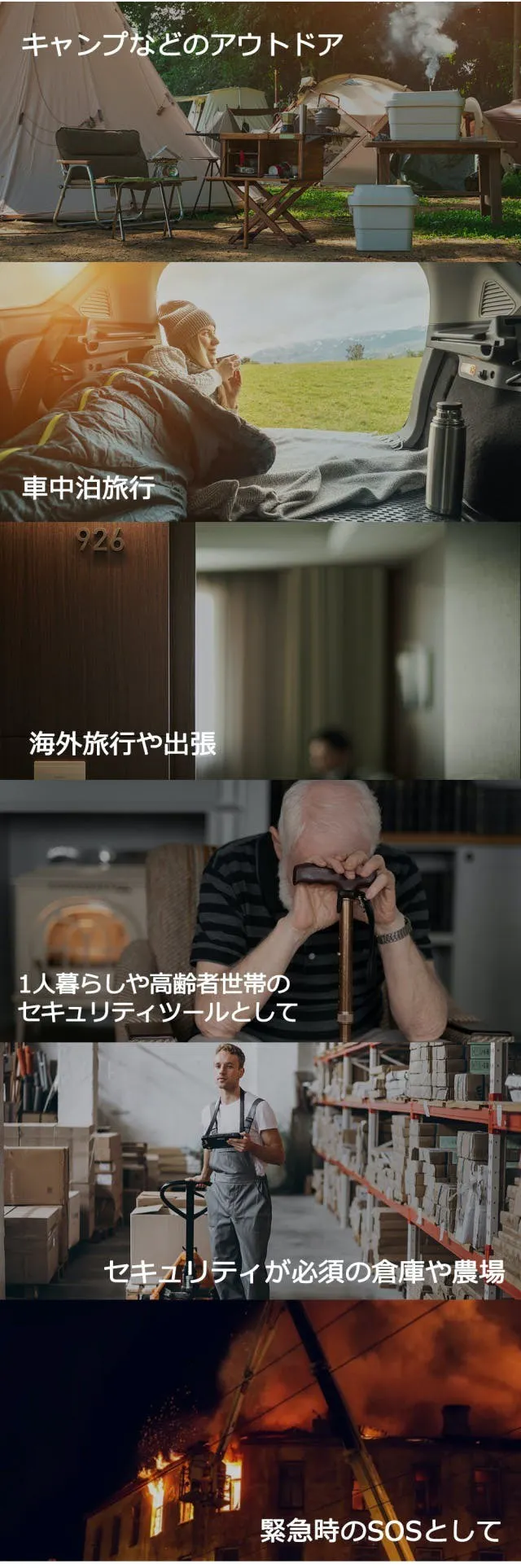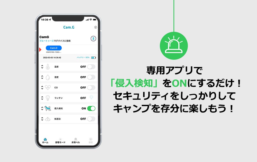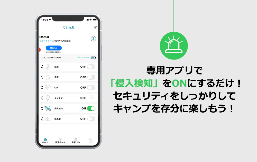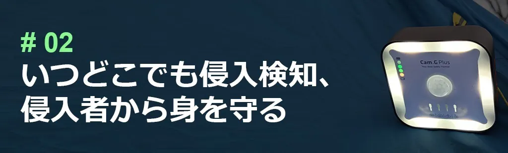 キャンプや車中泊、夜釣りなどアウトドア活動ではセキュリティが薄くなりがち…本製品の「侵入検知」ではテントやキャンピングカー、ホテルなど半径約5mまでの動作と熱を感知します。
