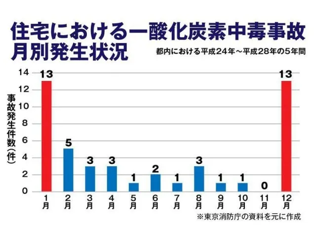 冬のキャンプや車中泊で発生する恐れのある一酸化炭素中毒、対策は取っていますか?下記は住宅に事故発生件数をグラフにしたものです。冬の事故発生率は他の月と比べ高いことが分かります。