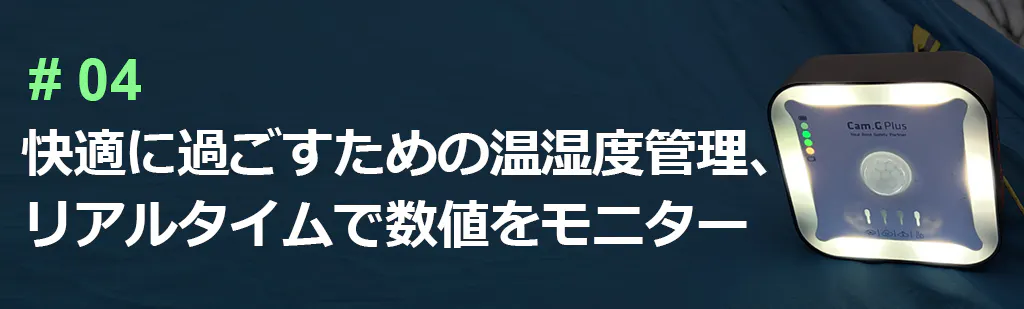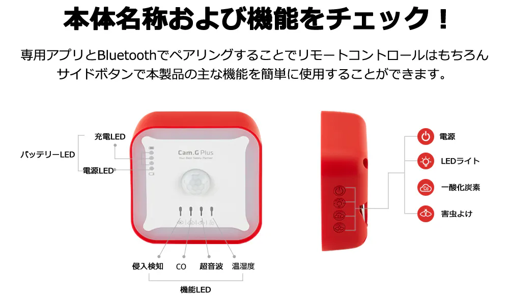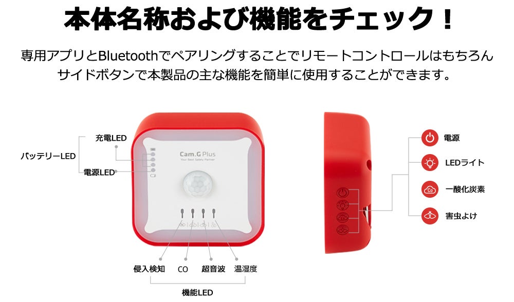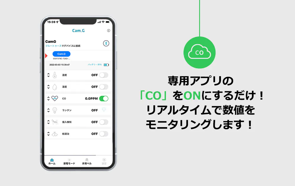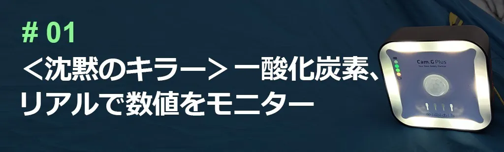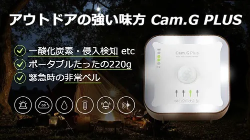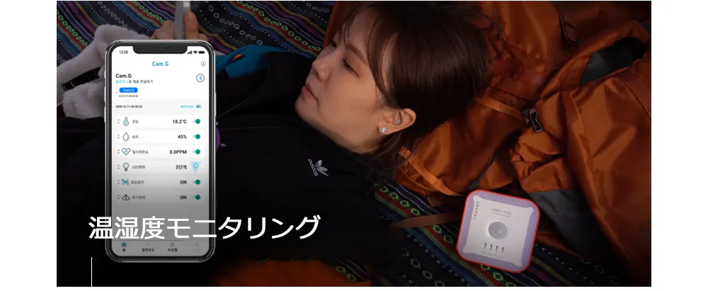 本製品「Cam.g PLUS」は、世界でも厳しいヨーロッパ、アメリカ、日本、韓国の一酸化炭素警報基準を適用しています。超精密一酸化炭素センサー採用しており、キャンプや旅行時に発生の恐れがある無色無臭の一酸化炭素の発生数値をリアルタイムでモニターします。基準値を超えるとアラームが鳴る仕組みとなっています。