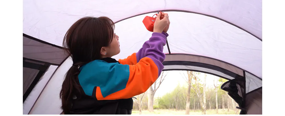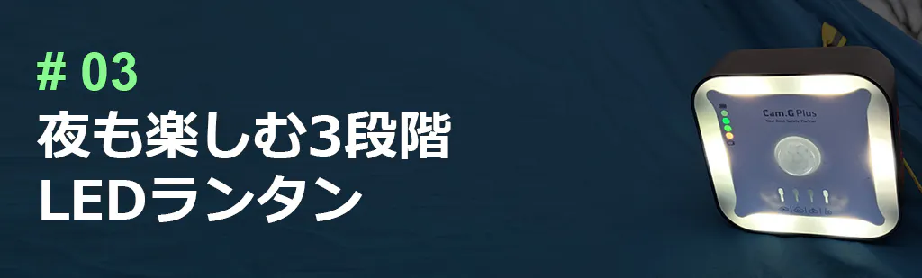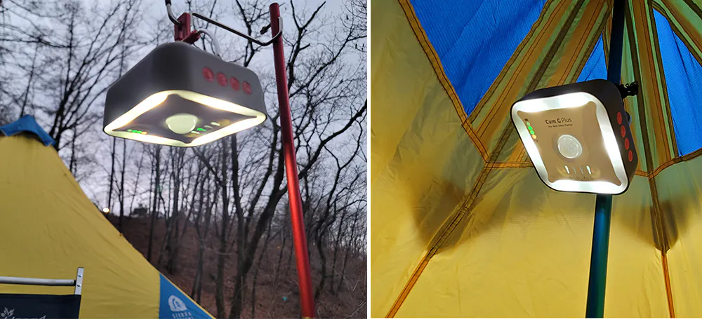 本体背面のスタンドにはフックがあるのでテントの天井に吊り下げて活用することもできます。