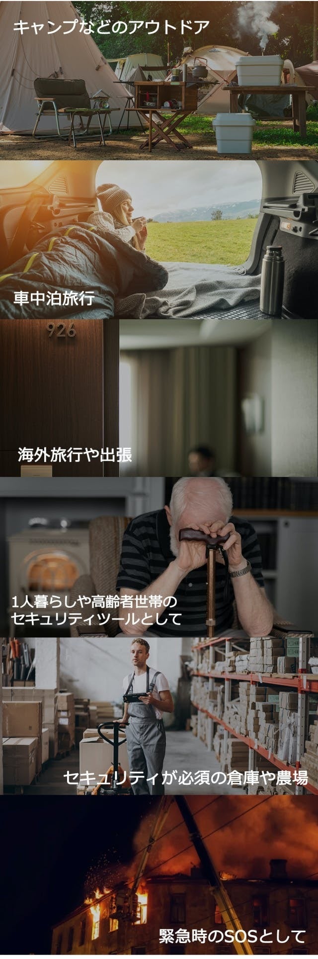 ❸ 車中泊・キャンプ・釣り・登山などのアウトドアシーンや、災害時にも一家に1台あると心強い!