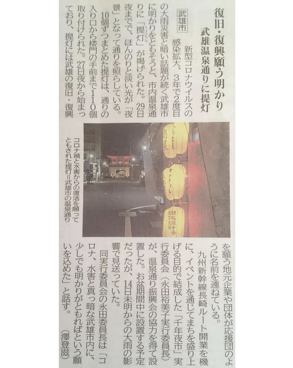 少しでも街の人に元気をと、武雄のシンボル武雄温泉の楼門につながる温泉通りを提灯でライトアップ。