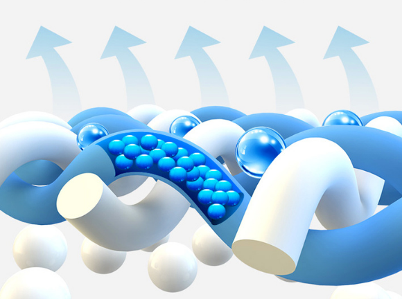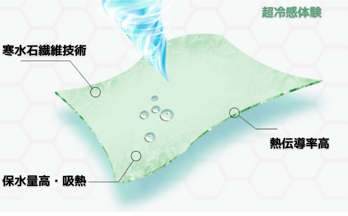 なぜなら、瞬冷シリーズに採用されている寒水石繊維生地は、太陽光やコンクリートの照り返しなど「外界」からの熱を遮断する一方、体の表面の熱は外部に逃がす放熱性を持っているからです。これは「熱伝導性」に秘密があります。