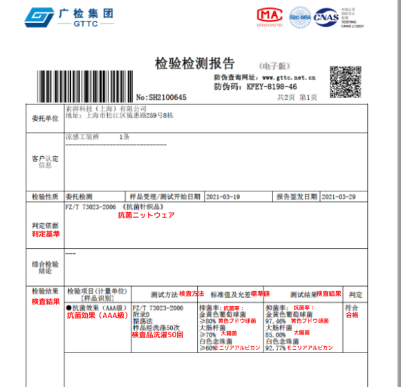 瞬冷シリーズは中国における「AAAレベル抗菌」の技術認証を受けています。AAAという用語は、FZ / T73023-2006「抗菌ニットウェア」テスト標準に由来します。通常、抗菌ニットウェアは、洗濯抵抗の回数と抗菌作用のある雑菌の種類に応じて、Aレベル、AAレベル、AAAレベルの3つのグレードに分類されます。