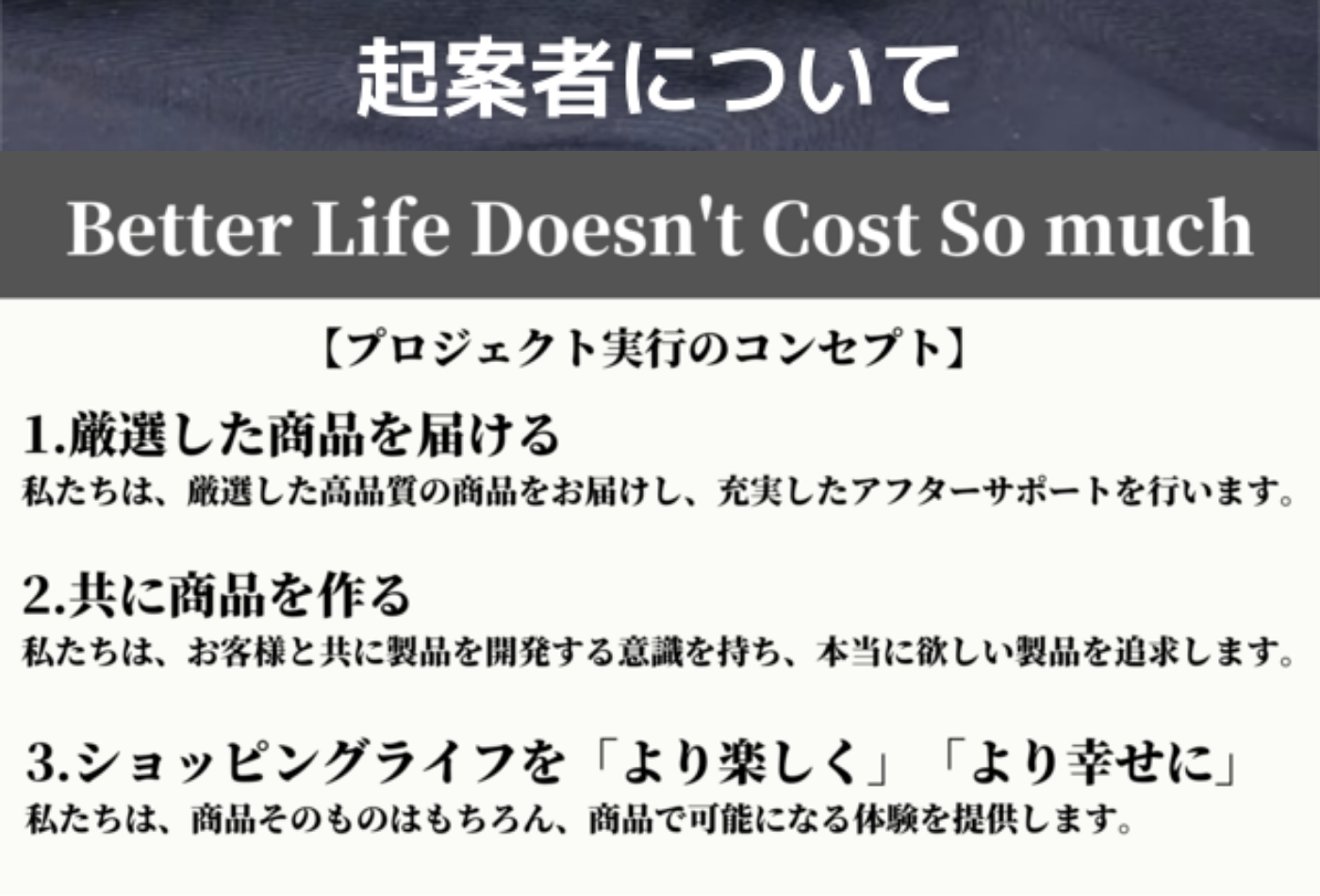 今後は世の中にある「良い製品」を厳選し、皆さまにお届けいたします。応援を宜しくお願い致します。