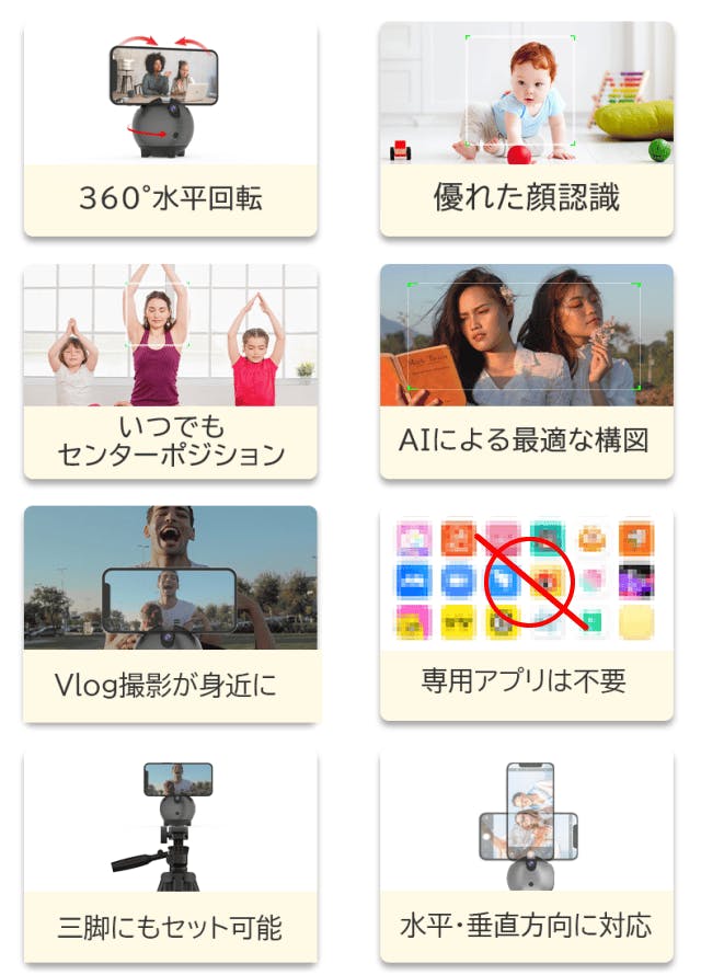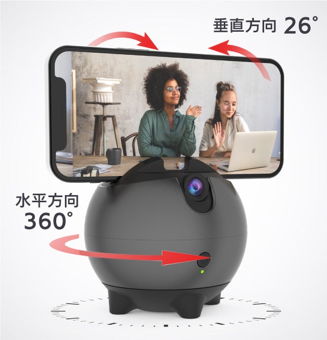 ・360度水平方法に人の動きを自動追尾。顔認識による自動構図で常にセンターポジションでの自撮り撮影が可能