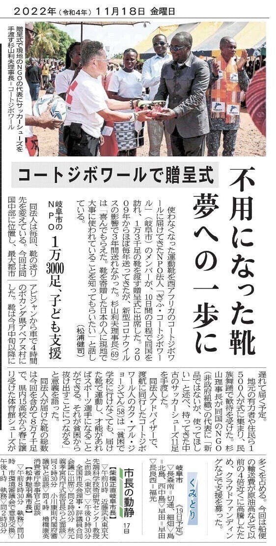2022/11/21 15:21お世話になっております。NPO法人ぎふコートジボワール理事長の杉山利夫です。11月18日の岐阜新聞に、現地での靴の贈呈式の様子を掲載して頂きました。また、帰国後に柴橋岐阜市長と市政記者クラブに、コートジボワールからの帰国報告、現地の様子を報告しました。下記写真は報告会の様子です。 この活動をこれからも続けて、広めていきたいと思っております。引き続き宜しくお願い致します。 もっと見る