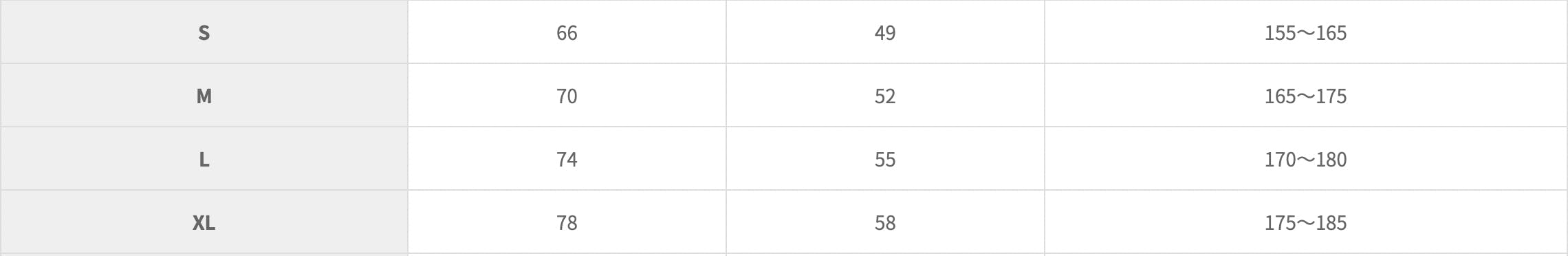 [サイズ表]サイズ・身丈・身幅・身長目安(単位:cm)