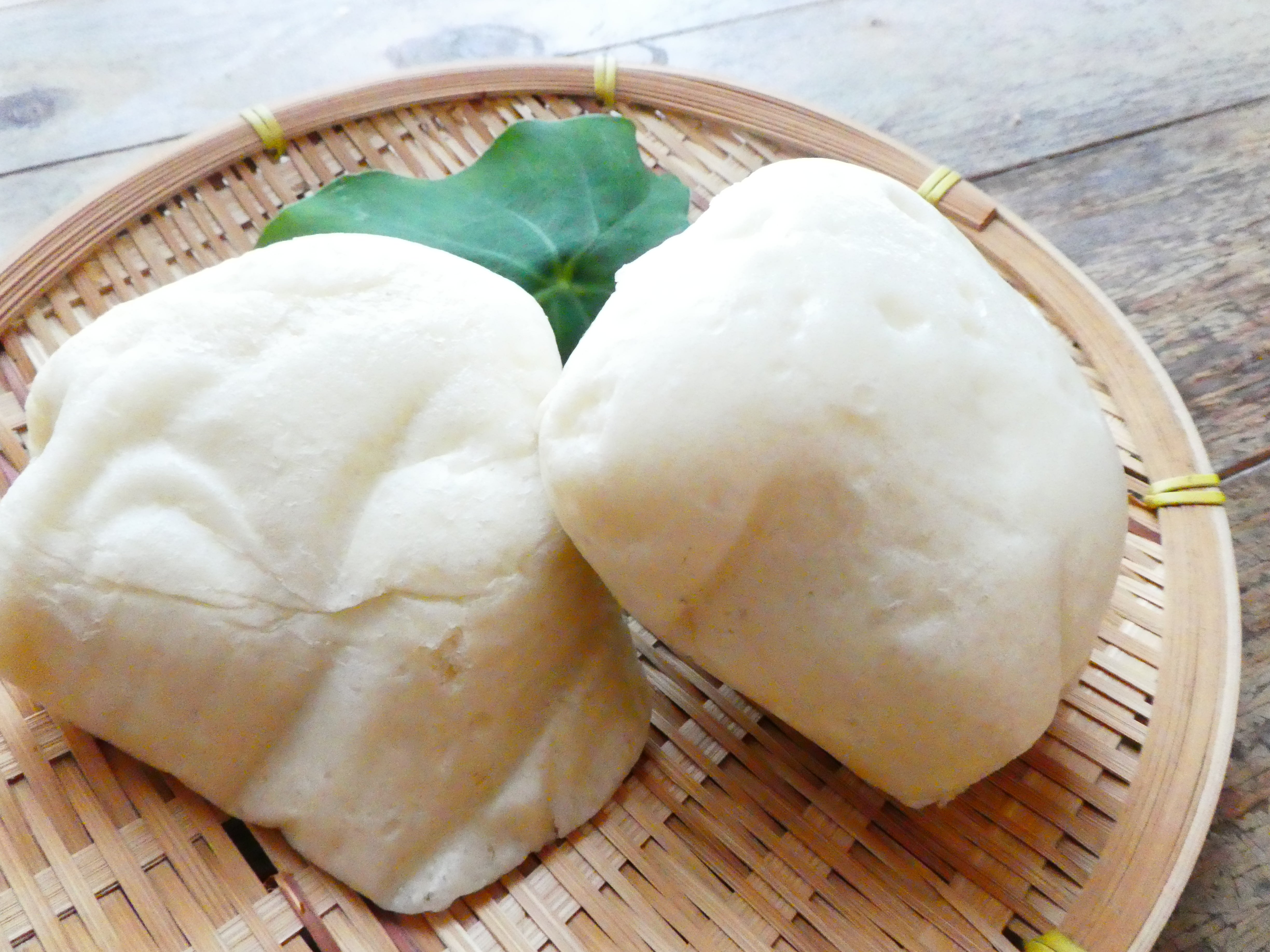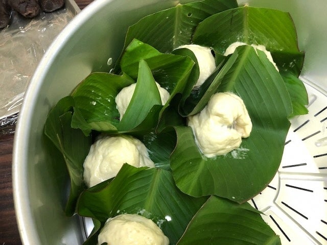 カンナの葉っぱに包んで蒸すため、しかくくてまあるい不思議な形に出来上がる。
