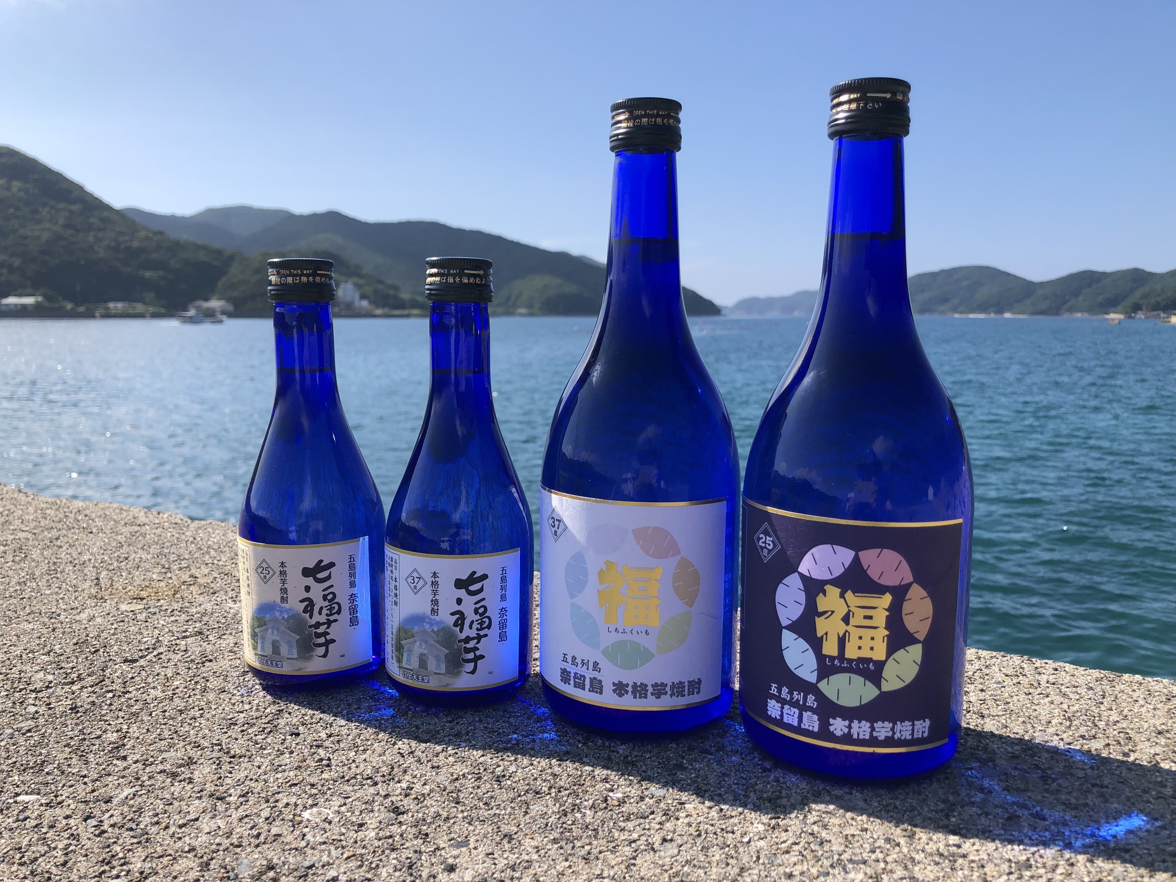 奈留島に伝わる希少なサツマイモ「七福芋」を使った本格芋焼酎。この焼酎を作っているのは、平地が少ない奈留島で貴重な食糧源であった七福芋を畑を耕すことから始めた窄中さん(そう、このプロジェクトチームの代表です)。「電気屋なのに、畑仕事までするとは思わんかったよ」と笑いながら話す裏には、「奈留島の特産品を作りたい」との島を想う熱い気持ちがあります。収穫後は桃並みの糖度になるという七福芋。焼酎だけど、フルーツワインのようなまろやかな飲み口が人気です。今回は、数量限定販売の江上天主堂デザインボトルセットをご用意しています。