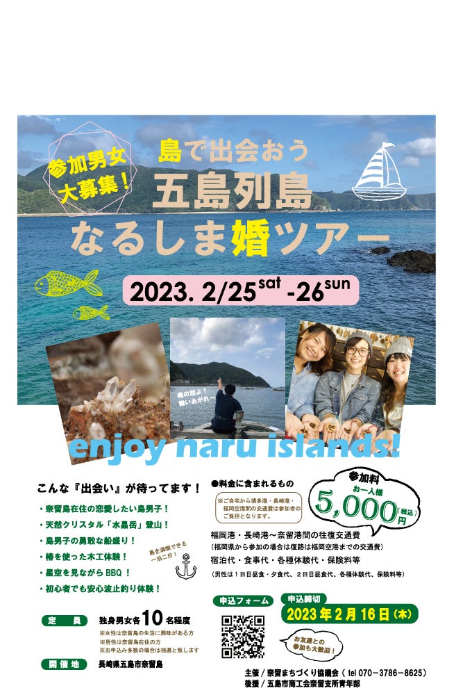 2023/01/26 12:36お久しぶりです!奈留島どがんね、今年も地域のみなさんと協力しながら、元気に営業しています。現在、火曜・土曜が食事ができる日なのですが、地元の方だけでなく、観光客やツアー客のみなさまにも利用していただいています。また、たくさんの方に使ってもらうためにもやい場内で講座を開いてみたり、みんなにとっての「もやい場」でいられるようにアレコレ頑張っています。地域がちょこっと盛り上がってきたところで、次は奈留の人口を増やそうと、「婚活イベント」をやってみることにしました!奈留島男子との出会いはもちろん、奈留島のいろんな素敵な瞬間に出会える2日間となります!内容はこーんな感じ。参加できるのは、奈留島の生活に興味がある独身女性と奈留島在住の独身男性です。年齢制限はありません!奈留島男子は、二次離島ということもあって、なかなか島外の婚活イベントに参加することができません。島外不出の秘蔵っ子に会えるチャンスです、ぜひぜひ島へお越しください!島外から参加の女性の方は、参加料5,000円に長崎港または博多港からの往復交通費・宿泊代・食事代・各体験料・保険料すべてコミコミなので、かなりオトク。奈留島での出会いにワクワクして来てほしいから、太っ腹なお値段となっております。ちなみに、もやい場もコースに入っていますよ〜!ぜひ奈留島に恋しに来てくださいね! もっと見る返礼品発送しています!