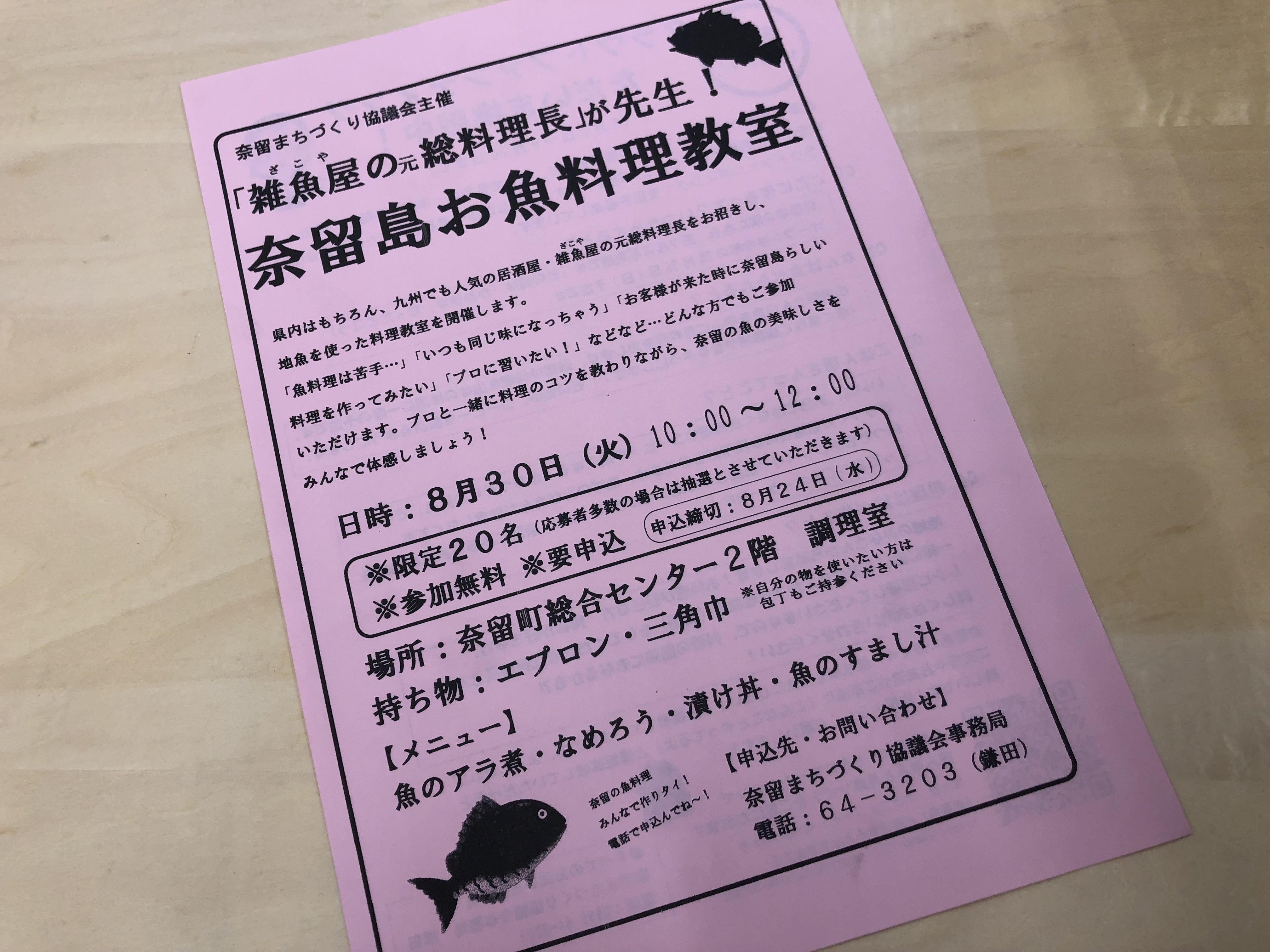このプロジェクトを進めるにあたり、奈留島のみなさんにさらに魚料理に目覚めてもらおうと、「お魚料理教室」を開くことにしました。奈留島出身の料理人の先生が教えて下さいます!