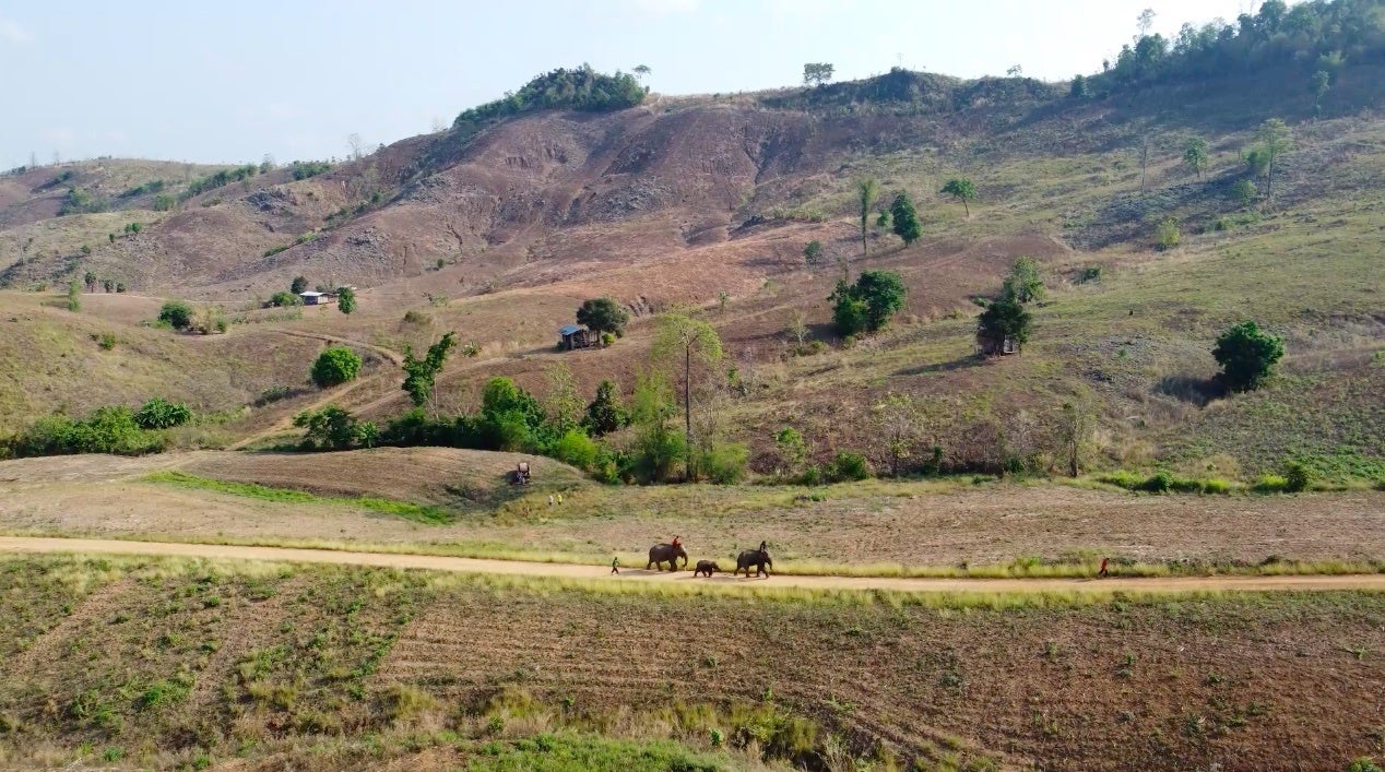 タイとミャンマーの国境近くの村に戻った象を撮影したとき、私たちが目にしたのは壮絶な森林破壊の現実でした。故郷の村周辺の森は換金作物の家畜飼料用トウモロコシ畑に一変し、住処のない里帰りした象たちは村から20キロ離れた森にとどまるしかないのです。徒歩の旅全行程を撮影しましたが、その途中に出現する禿山の光景に私たちは言葉失いました。象〜人〜観光産業〜自然破壊のつながりが制作チームの中で見え始めています。