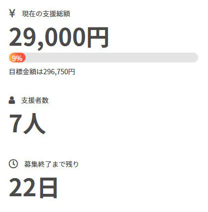 現在の調達率は9%、パトロン様は7名となっております。