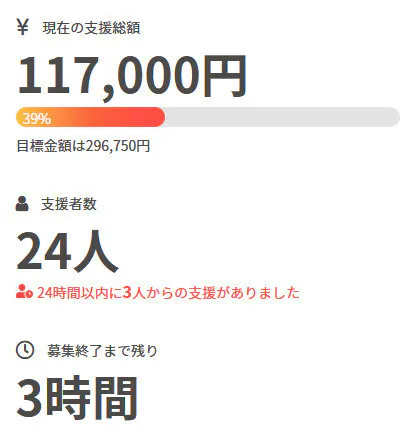 現在の調達率は39%、パトロン様は24名となっております。