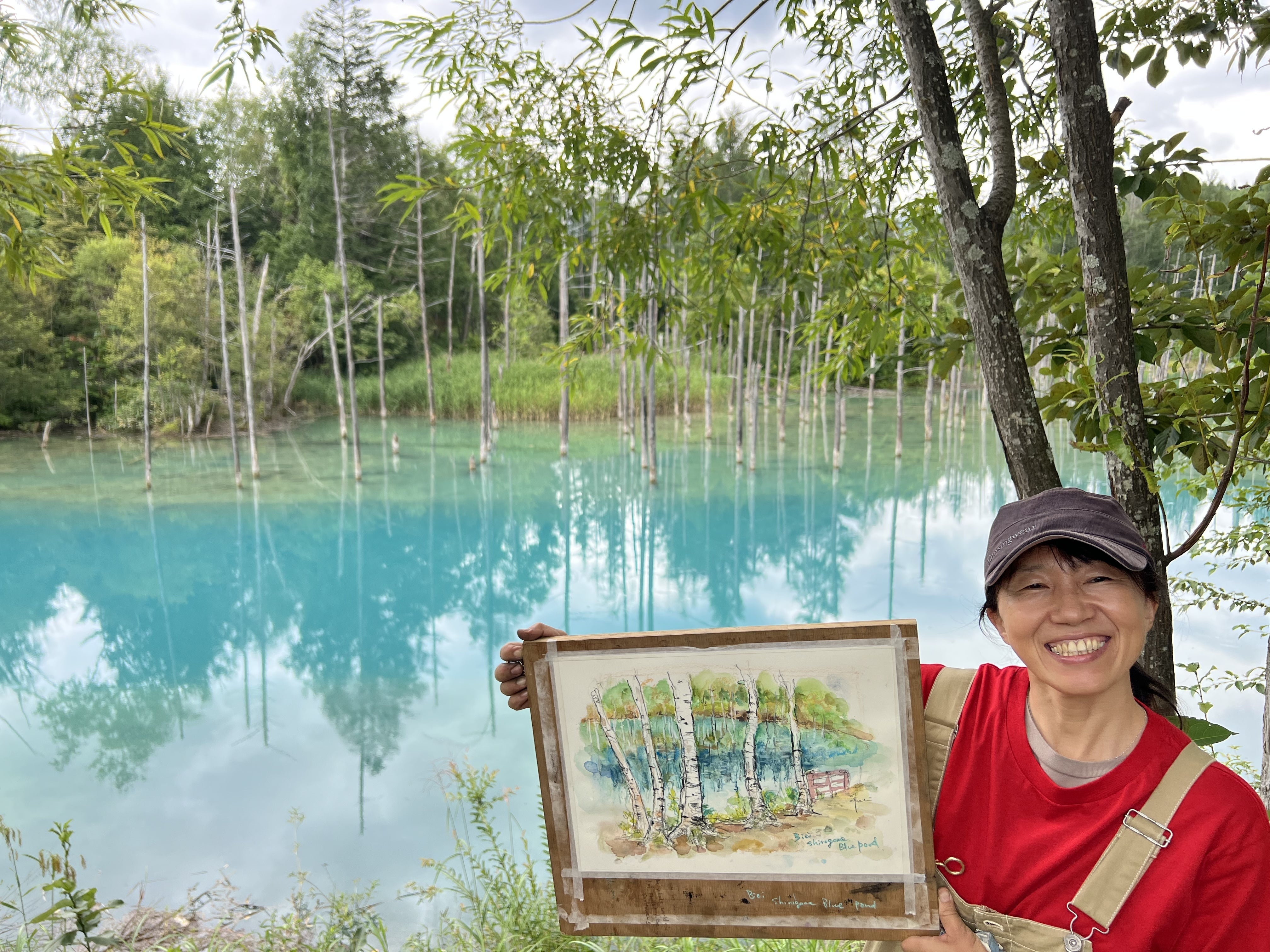 本当に青い池で(この日は曇で)空の反射でなはく池の水の成分が反応しての天然の色!でもすご〜い人だらけ!映えら写真をもとめて凄い観光客でしたがめっちゃ絵に集中して楽しくえがけました!^_^