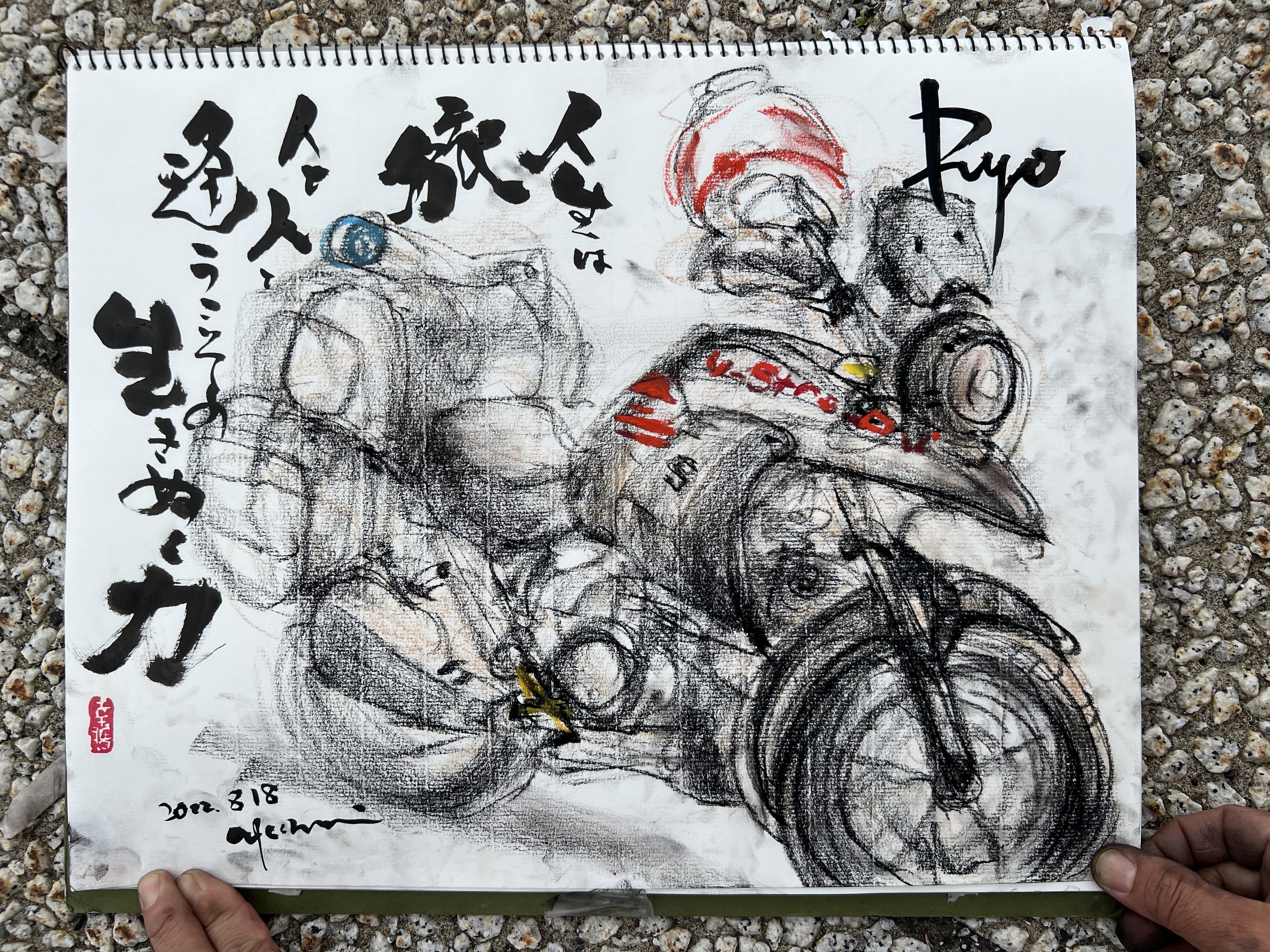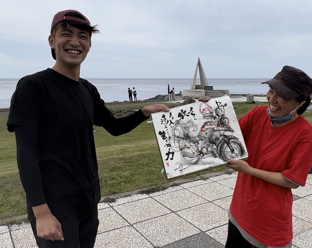 宗谷岬で出逢ったRyo君!日本一周を去年一度経験されてからリベンジ北海道です!と元気に旅武勇伝を聞かせてくれました!今度はアフリカを目指すそうです!がんばれー‼︎彼の愛車のスケッチ贈呈式‼︎宗谷岬をバックにパチリ。