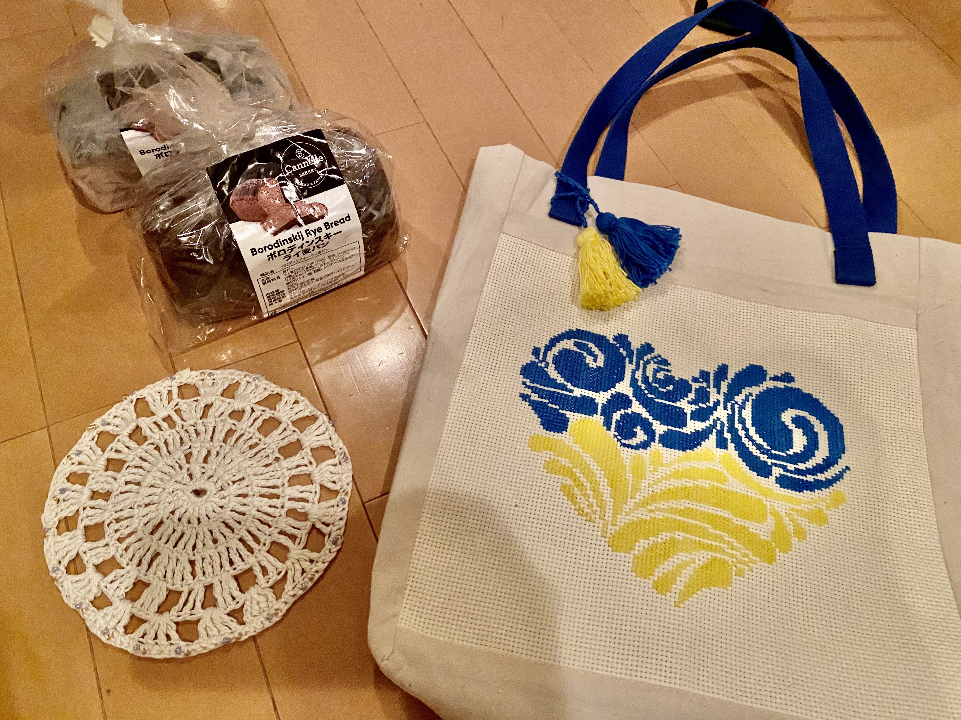 避難民の方が手作りした鍋敷と