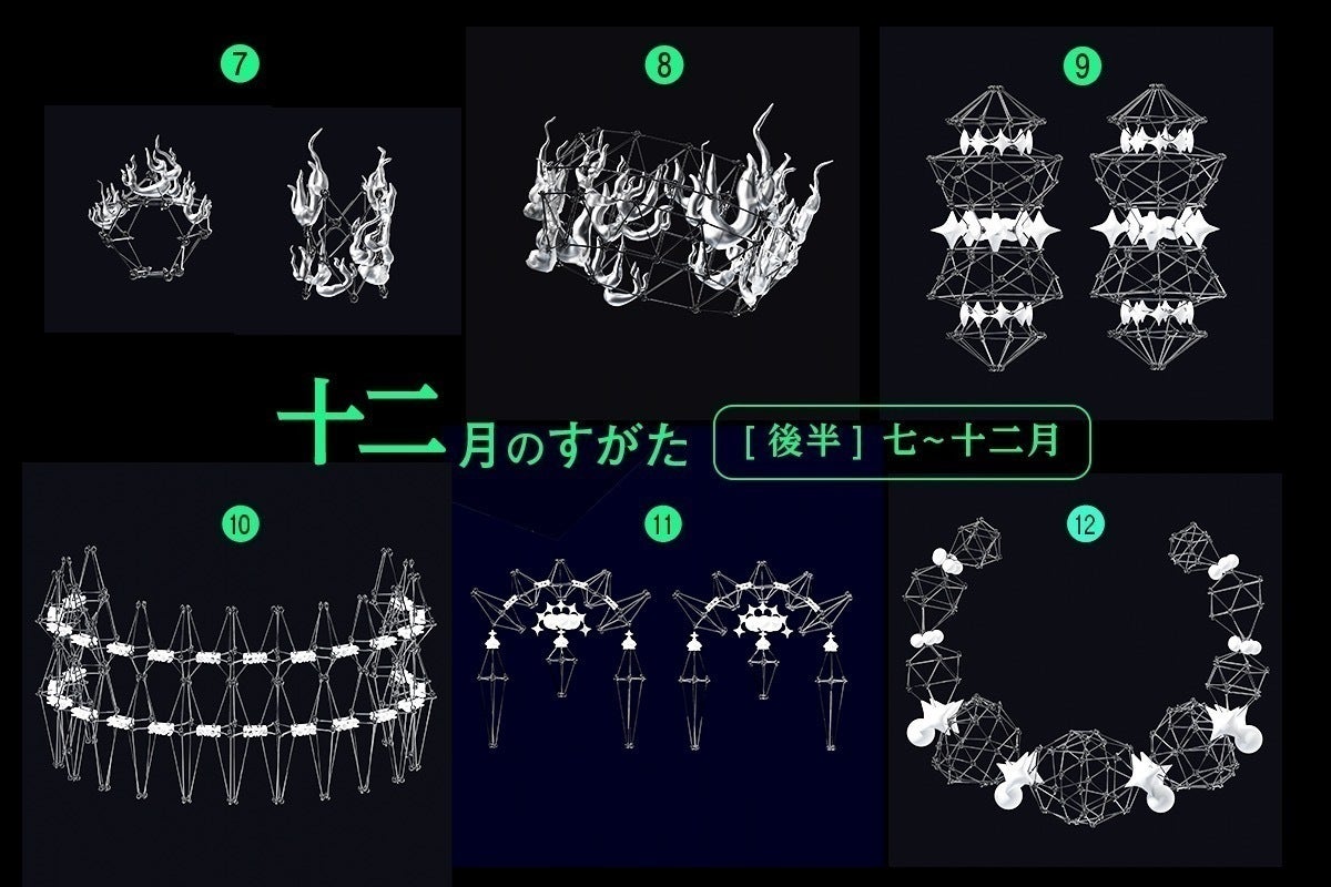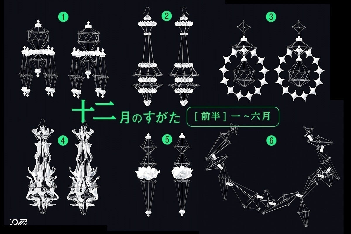 十二ヶ月をイメージしてデザインした全12種のアクセサリー設計図を現実世界に出力します。各種1〜2人までの受付で、耳飾りの場合はピアス/イヤリングの指定が可能です。