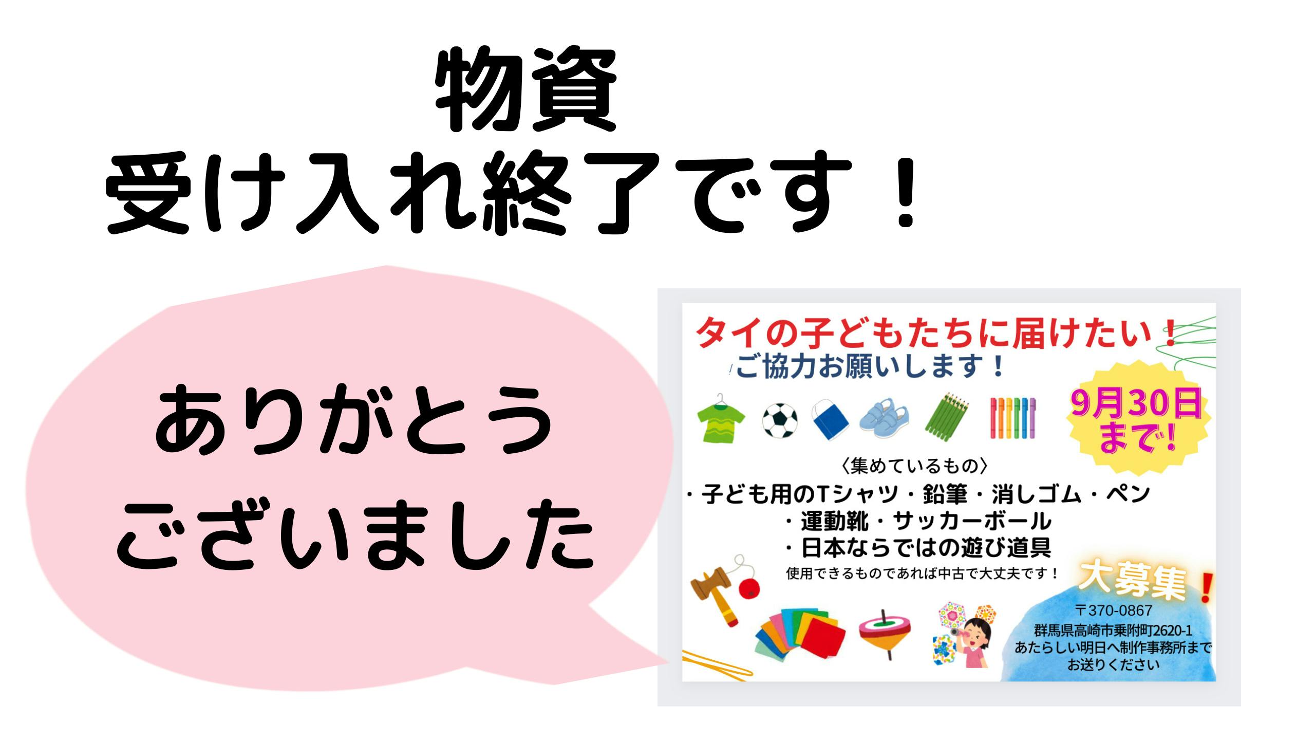 皆様、タイへの物資をたくさん送ってくださってありがとうございました!!物資の受け入れは、無事終了となりました!