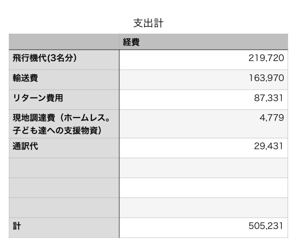 また、今回行けなかった1名分のキャンセルを行い、半額程返金がある予定です。合わせて総支出となります。(不足分は、プロジェクト参加者でお支払いさせていただきました。)
