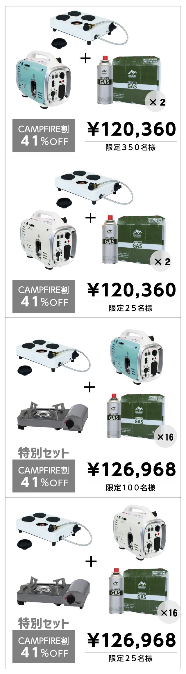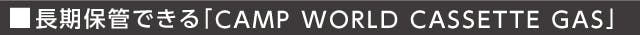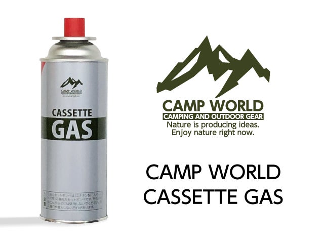 長期保管に優れた「CAMP WORLD CASSETTE GAS」。これひとつあれば「発電」「調理」を簡単に使うことができる、それがこのセット最大の魅力です。