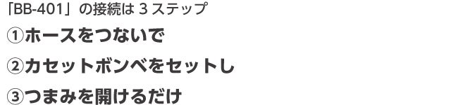 また、コストパフォーマンスを良くするためにボンベを無駄なく使える工夫もしてあります。「BB-401」は残量の違うカセットボンベ同士でもセットすることができます。「BB-401」が圧力を一定に調整することで、常に安定した供給が可能なのです。