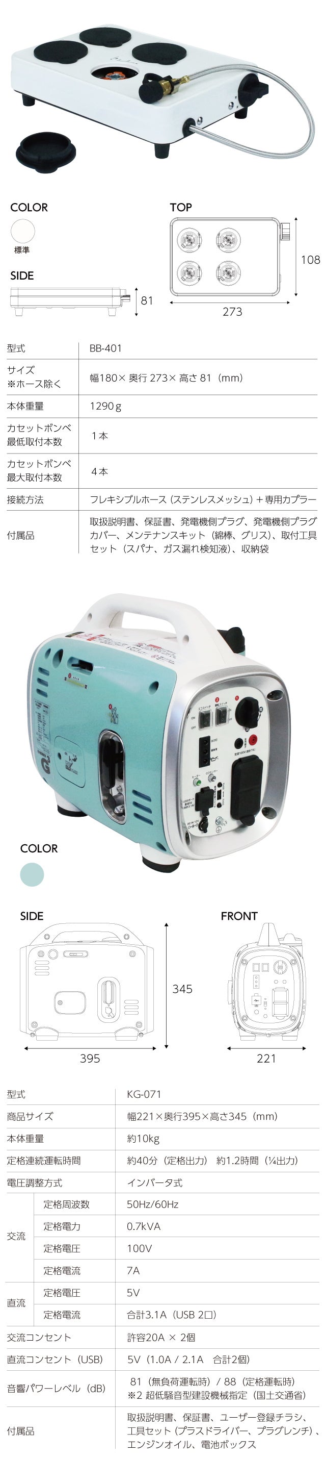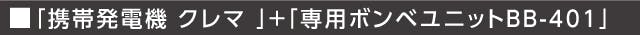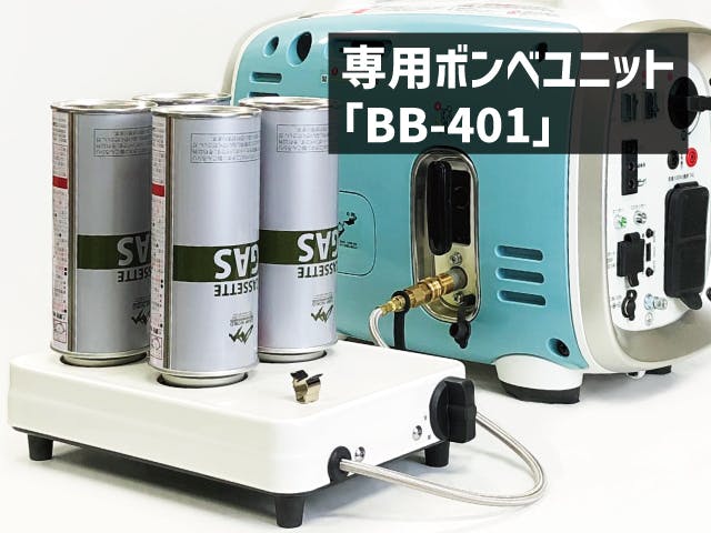 発電機「クレマ」の最大の特長は、入手・使用・保管など利便性に優れたカセットボンベを燃料にしているということです。この発電機「クレマ」はカセットボンベ1本だけで使えますが、「BB-401」を接続することでボンベの使用本数を増やし、グーンと運転時間を伸ばすことができます。