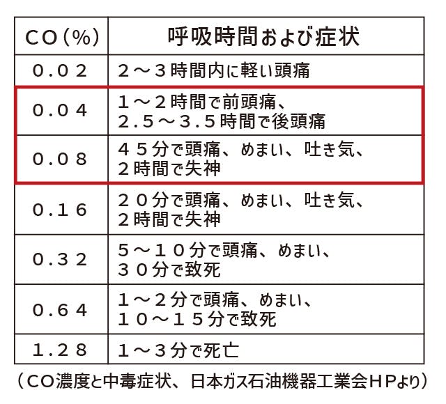 濃度の基準は日本ガス石油機器工業会が設定した以下の表を参考にしています。エンジンは、10分間の平均濃度が400ppm以上もしくは最大濃度が800ppm以上になると自動で停止します。
