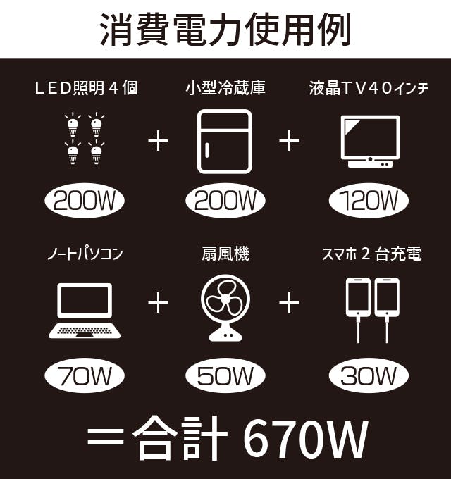 また、ポータブル電源を組み合わせれば発電した電気をさらに賢く使えます。消費電力の多い時間帯はパワフルな発電機で発電しながら充電して、消費電力が少ない時間帯はポータブル電源に貯めておいた電気を使えば、たとえ音や排気が気になる夜間でも安心した生活ができます。