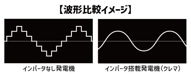 「クレマ」はインバータ搭載の発電機です。家庭用コンセントと同じ正弦波の良質な電気を発生させるから、パソコンなどの精密機器の充電も安心して行うことができます。
