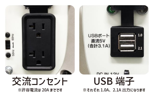 交流コンセントは2つ搭載。他にUSBも付いているので、充電ケーブルを直接挿してスマホなどの充電も可能です。