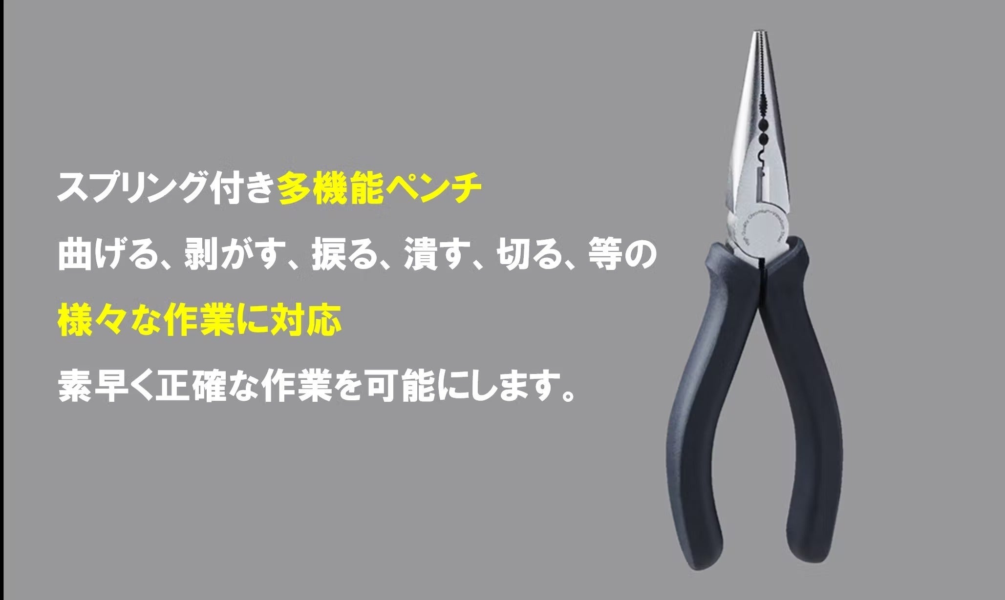 HOTO ペンチは曲げる、剥がす、捩る、潰す、切る、等の様々な作業に対応したスプリング付き多機能ペンチです。素早く正確な作業を可能にします。