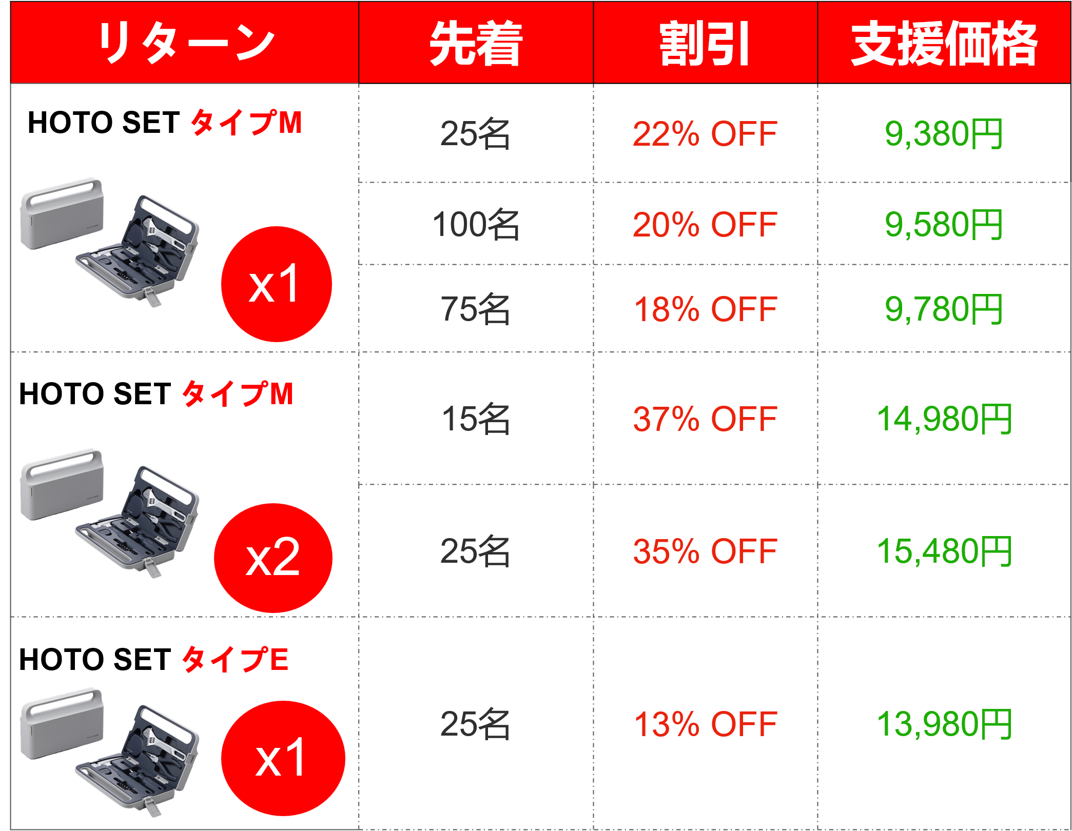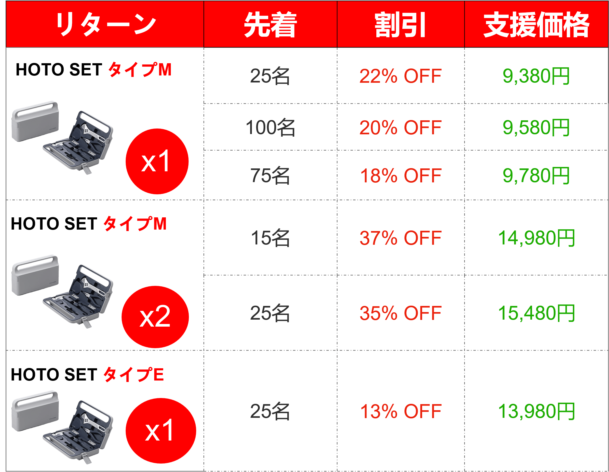 ・商品仕入資金、輸送、支援の皆さまへの配送費・商品パッケージ等の制作費用・HOTO TOOLSETをより多くの方に知っていただくためのプロモーション費用・メーカーの優れた商品を日本市場にご紹介するのに必要なマーケティング費用