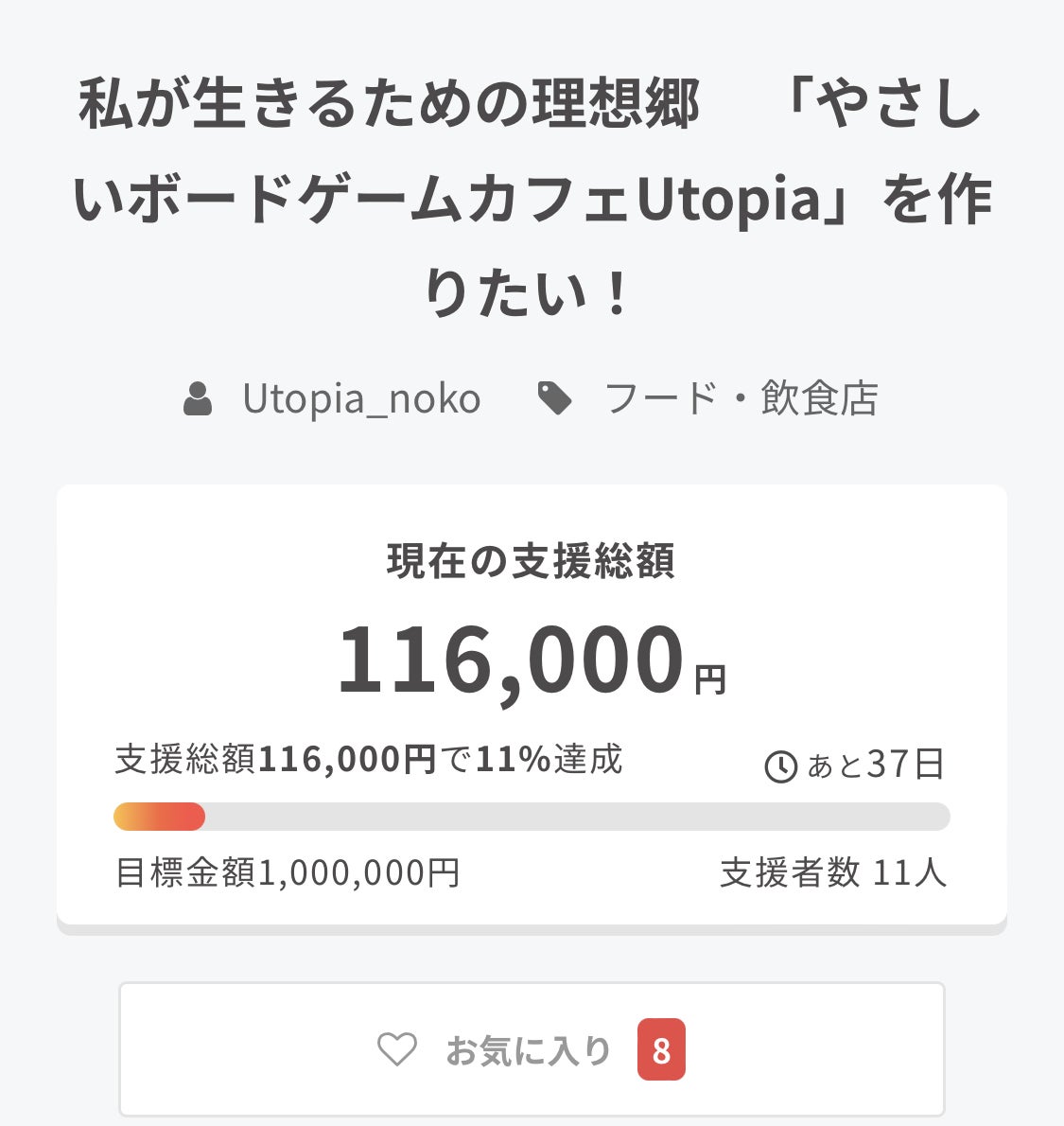 みなさんこんばんは、プロジェクトオーナーの、のこです。やさしいボードゲームカフェUtopiaは無事オープン迎え、プレオープンから毎日たくさんのお客様にご利用いただいてます!先日ツイートしましたボードゲームモチーフのカクテルも大変反響があり、ご来店いただいた多くのお客様が注文される人気ドリンクとなりつつあります。たくさんの方にUtopiaをご利用いただいて、日々嬉しく思っています。さて、クラウドファンディングの支援募集締切が丁度1週間後、16日に迫ってまいりました。既に多くの方にご支援いただき、30万円を超える額が集まっています。あと7日、少しでも多くの支援金が集まるよう御協力いただけると幸いです。「気になってはいるけど支援はまだしてない」という方は、16日の夜24時までにご支援いただけるようよろしくお願いします。