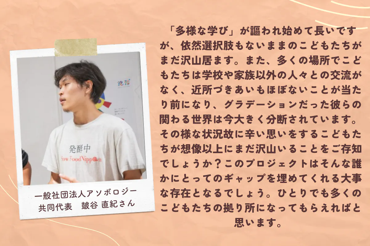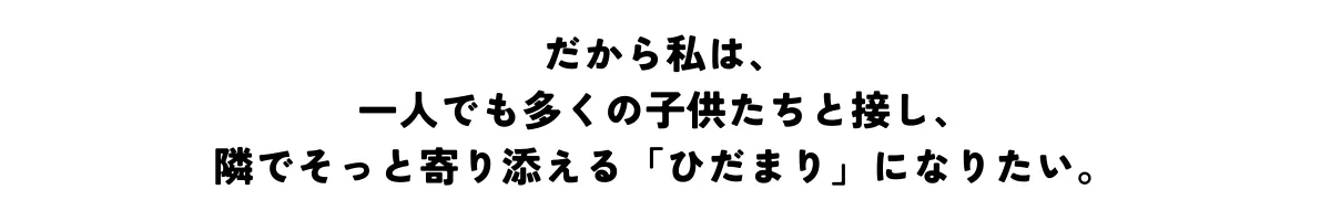 頼る場所がない子供たちの気持ちを痛いほど分かる私だからこそ、学校や家庭に行き場がない子供たちに、新たな選択肢となる居場所を作りたい。