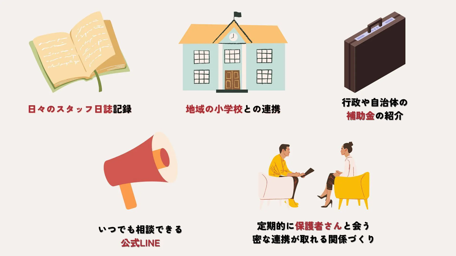 子供たち一人ひとり、そして、働く保護者さん一人ひとりに向き合うために、このような取り組みを行います。