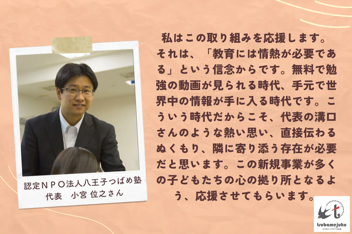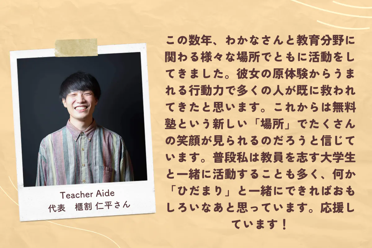 楽しい学びがあり、沢山の人がいる。そして、子供たちの居場所の一つになっている。子供だけでなく親御さんも含めて、一人ひとりの意見や思いに耳を傾け支えらえれるような、そんな無料塾にしたいと思っています。
