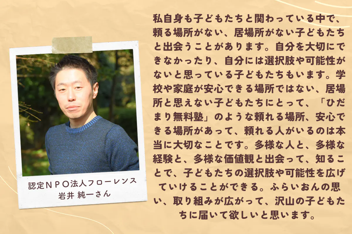 私は現在、18歳以下の子どもたちに無料で教育を届ける「無料塾」を全国で開校しているNPO法人を運営しています。そんな私たちが、今回なぜ「ひだまり無料塾」を始めるのか。その経緯や思いなどをお話ししたいと思います。