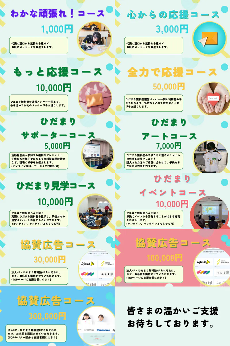 皆様にご支援頂いた資金は、「ひだまり無料塾」の必要物品、広告費、CAMPFIRE手数料に大切に使用させていただきます。