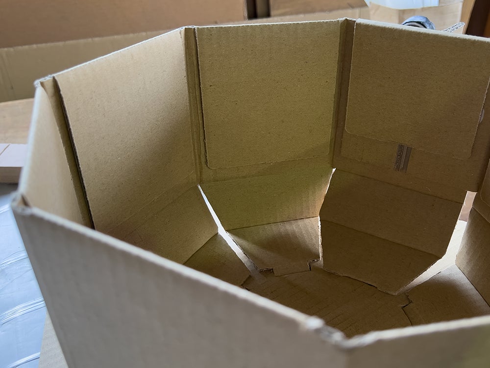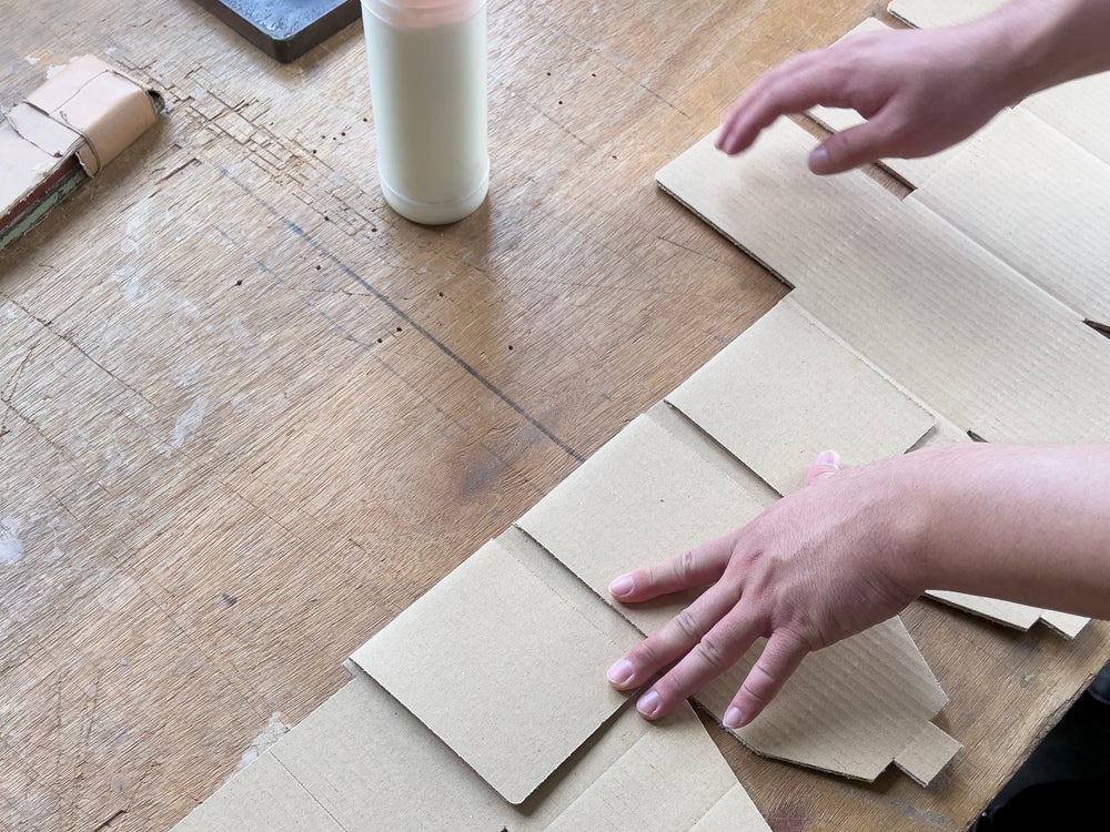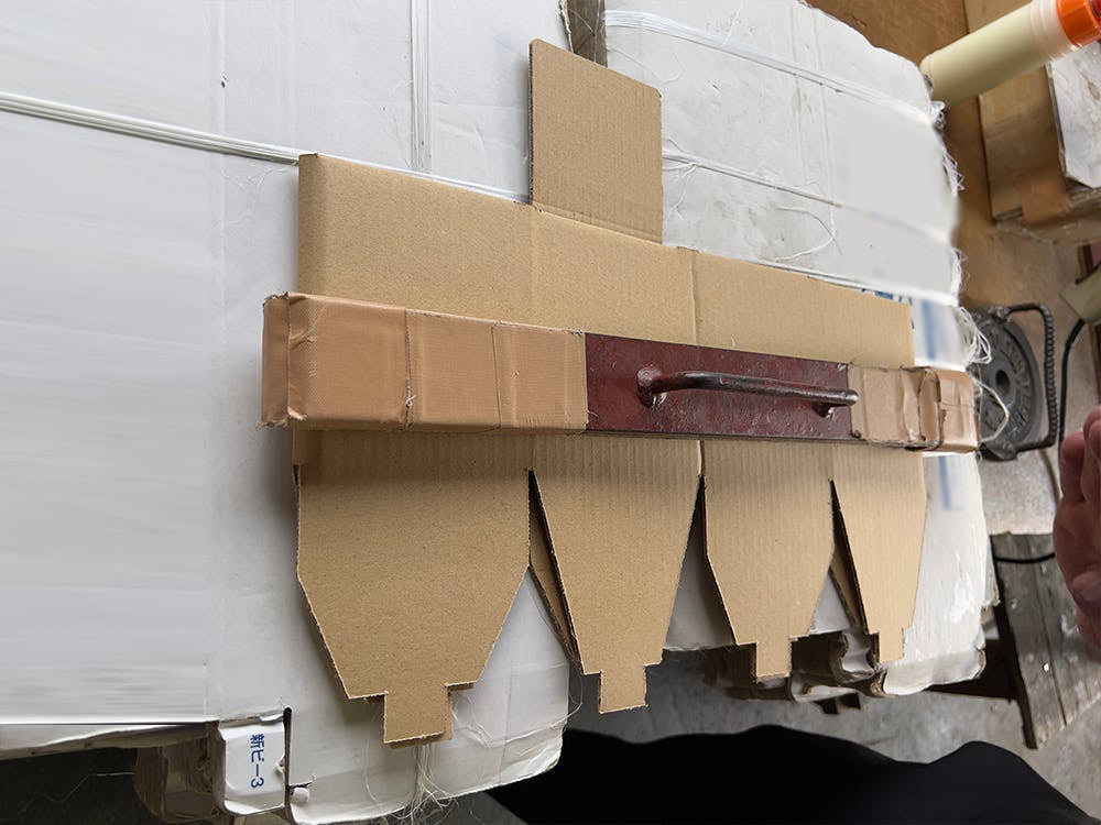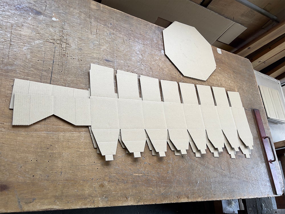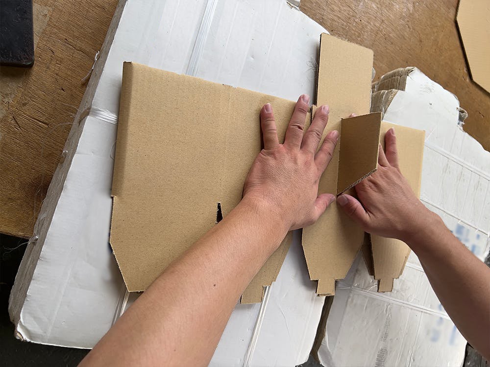 型で抜いた段ボールベッドの様子はこんな感じです。組み立てる前はこんな状態になっています。ここから人の手で組み上げていきます。