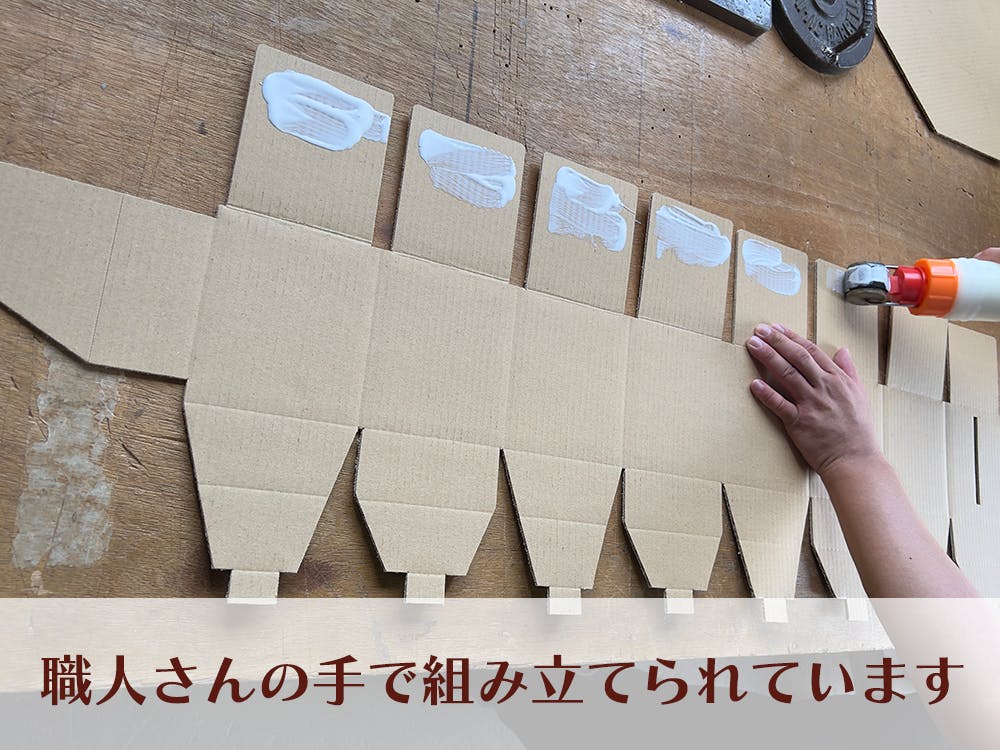 綺麗には人の手によって貼り付けられて、作られています。組み立てやすさにもこだわって細かい張り合わせる間の大きさも再度調整しています。