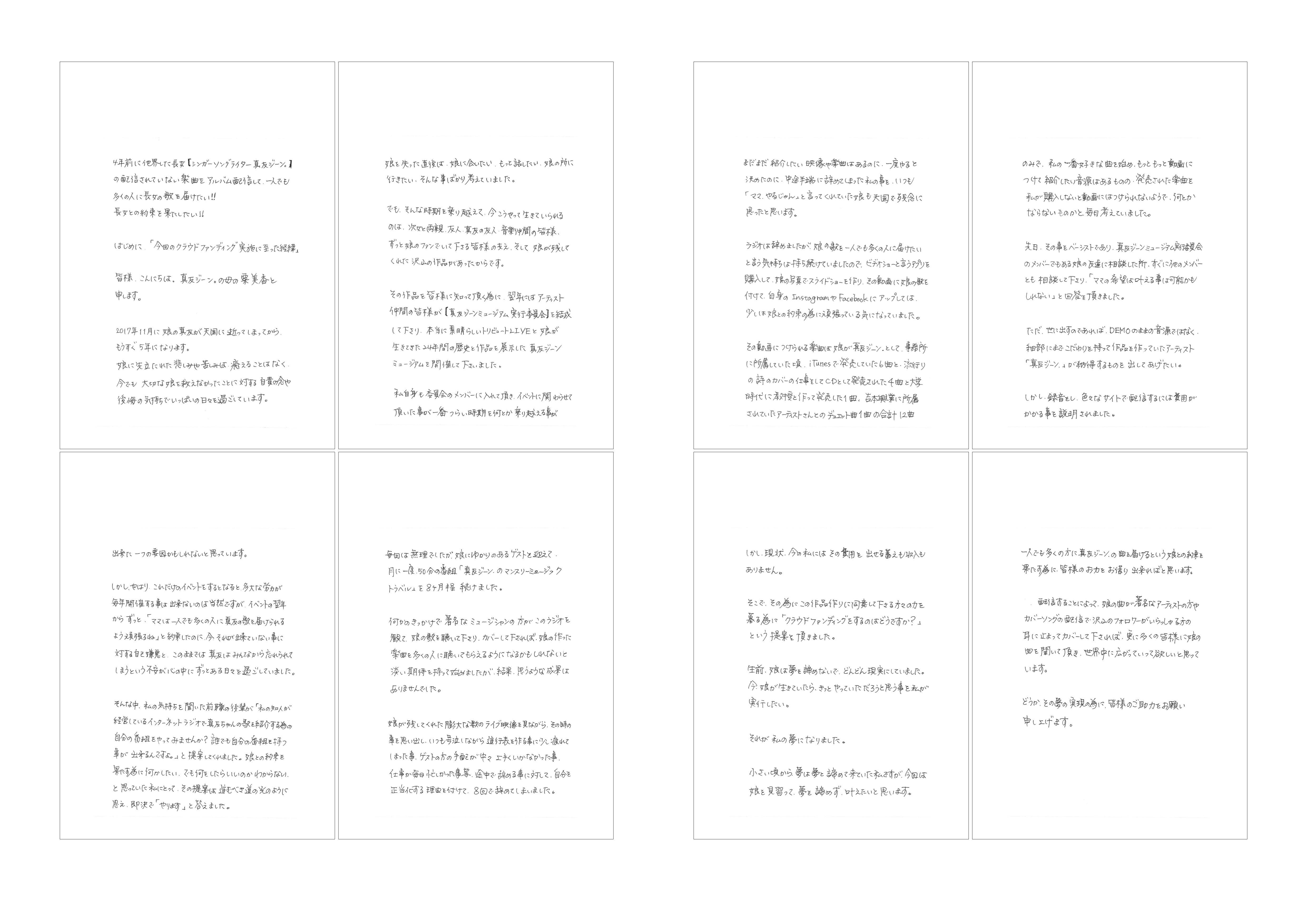 一人でも多くの方に真友ジーン.の曲を届けるという娘との約束を果たす為に、皆さんのお力をお借り出来ればと思います。
