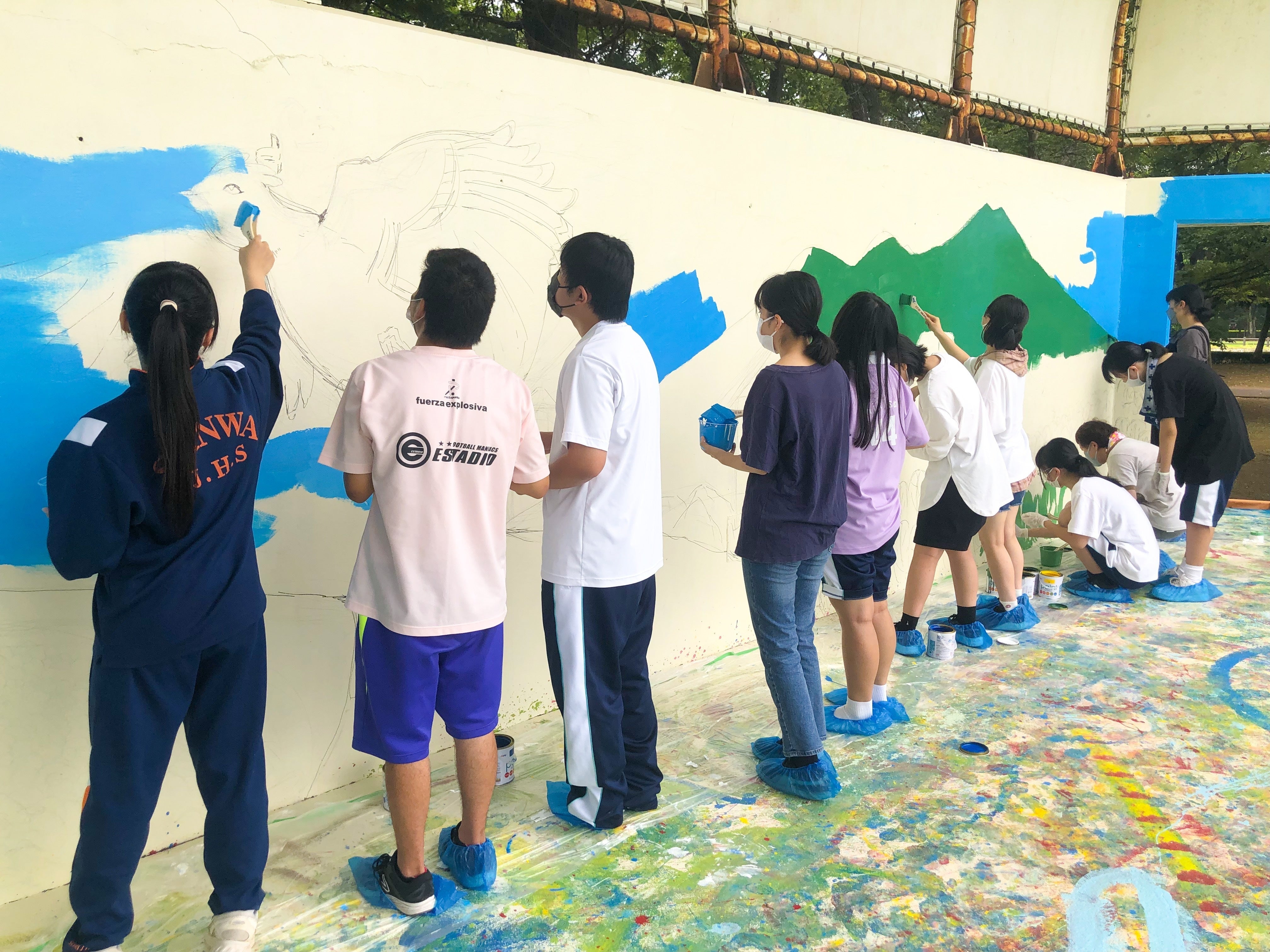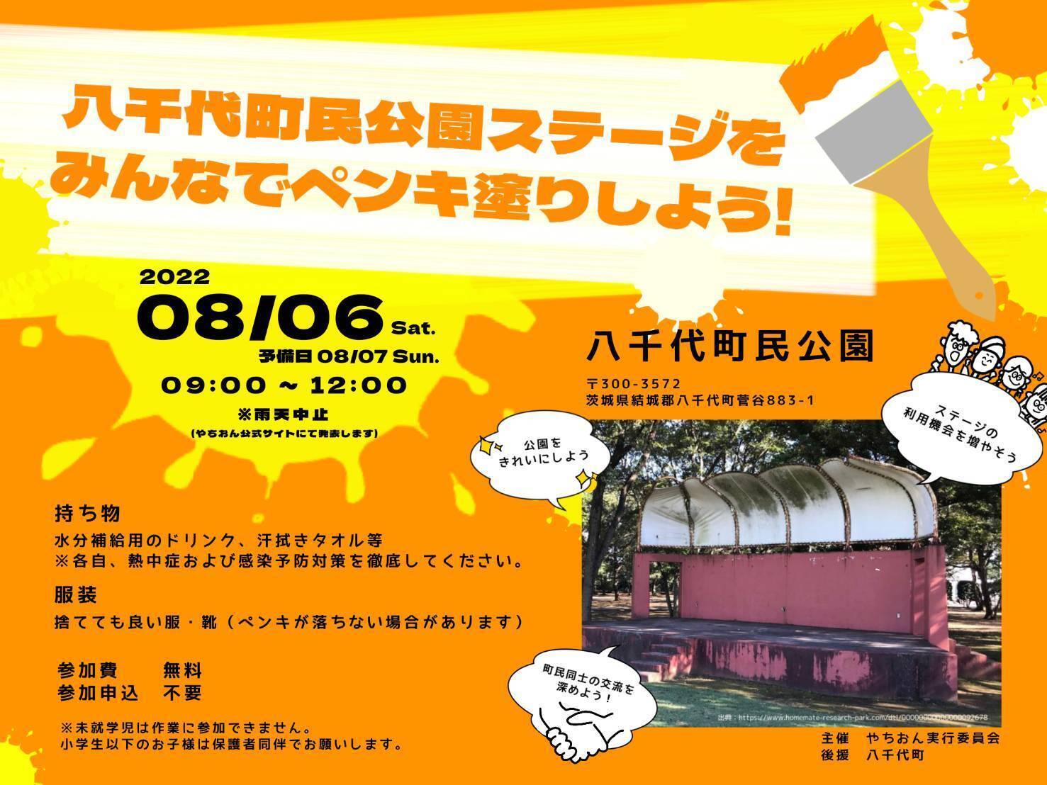 今回の開催に先立ち、会場の八千代町民公園ステージを綺麗に生まれ変わらせたいと思い、八千代高校の美術部の学生さんや地域住民の方々と協働してペンキ塗りを行いました。