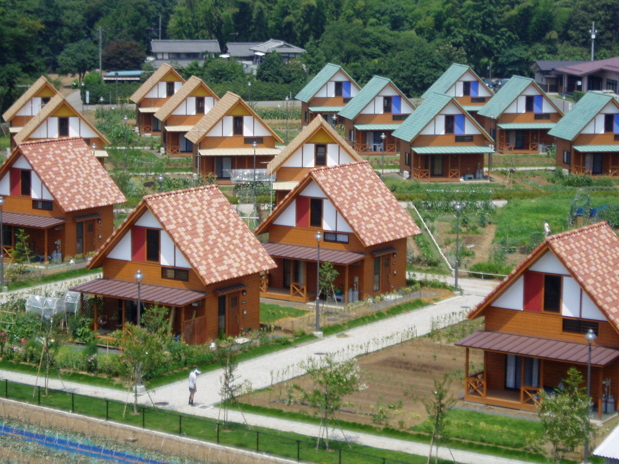 個性的な家屋が並ぶ『クラインガルテン八千代』は、日帰りや宿泊で野菜作りが体験できる人気の農園施設です。