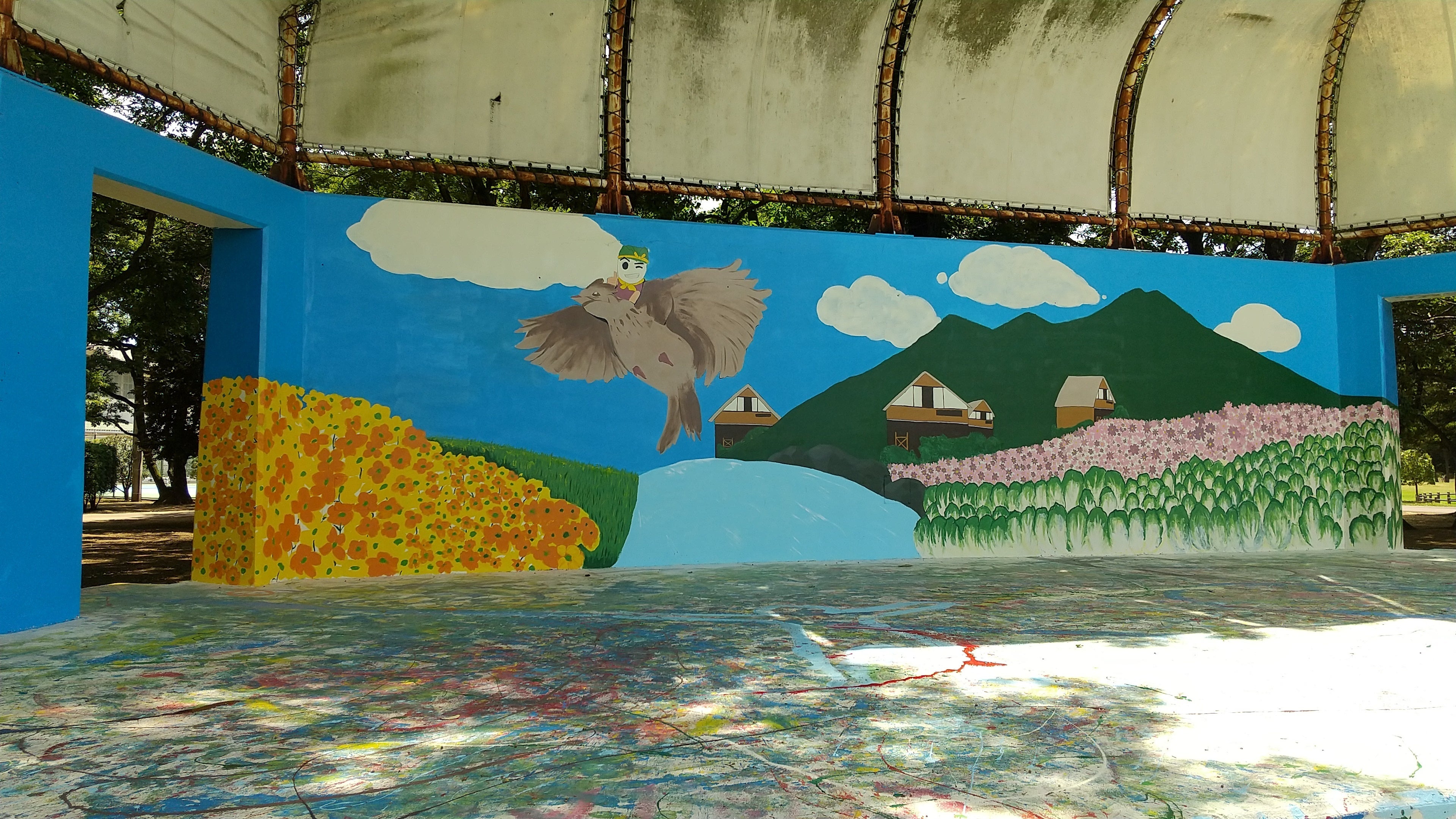 正面の壁面は町の鳥であるひばりを中心に、クラインガルテン八千代、四季を表す菜の花、青空、コスモス、白菜を描いていただき、素敵なステージが完成しました。