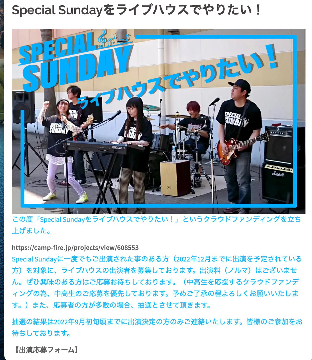 Special Sundayをライブハウスでやりたい!出演者の募集を開始しました。